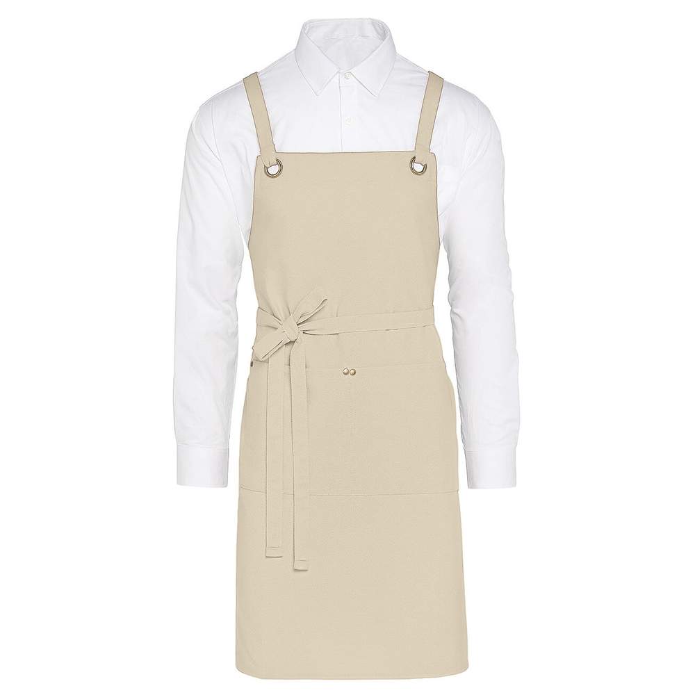 Ten fartuch z krawatem z płótna został zaprojektowany z myślą o użytku zawodowym. Jest wyposażony w dwa oczka i nitki z patynowanym mosiężem dla zwiększonej trwałości. Jego kroj zapewnia dużą swobodę ruchu, co czyni go odpowiednim do środowisk gastronomicznych i usługowych. Obwód szyi jest regulowany dzięki paskom krzyżującym się z tyłu. Delikatne płótno sergowe zapewnia optymalny komfort. Ma dużą środkową kieszeń zszyta w dwa przedziały o wymiarach 40 x 20 cm. Wymiar : 85 x 75 cm. Skład : 100% bawełna.