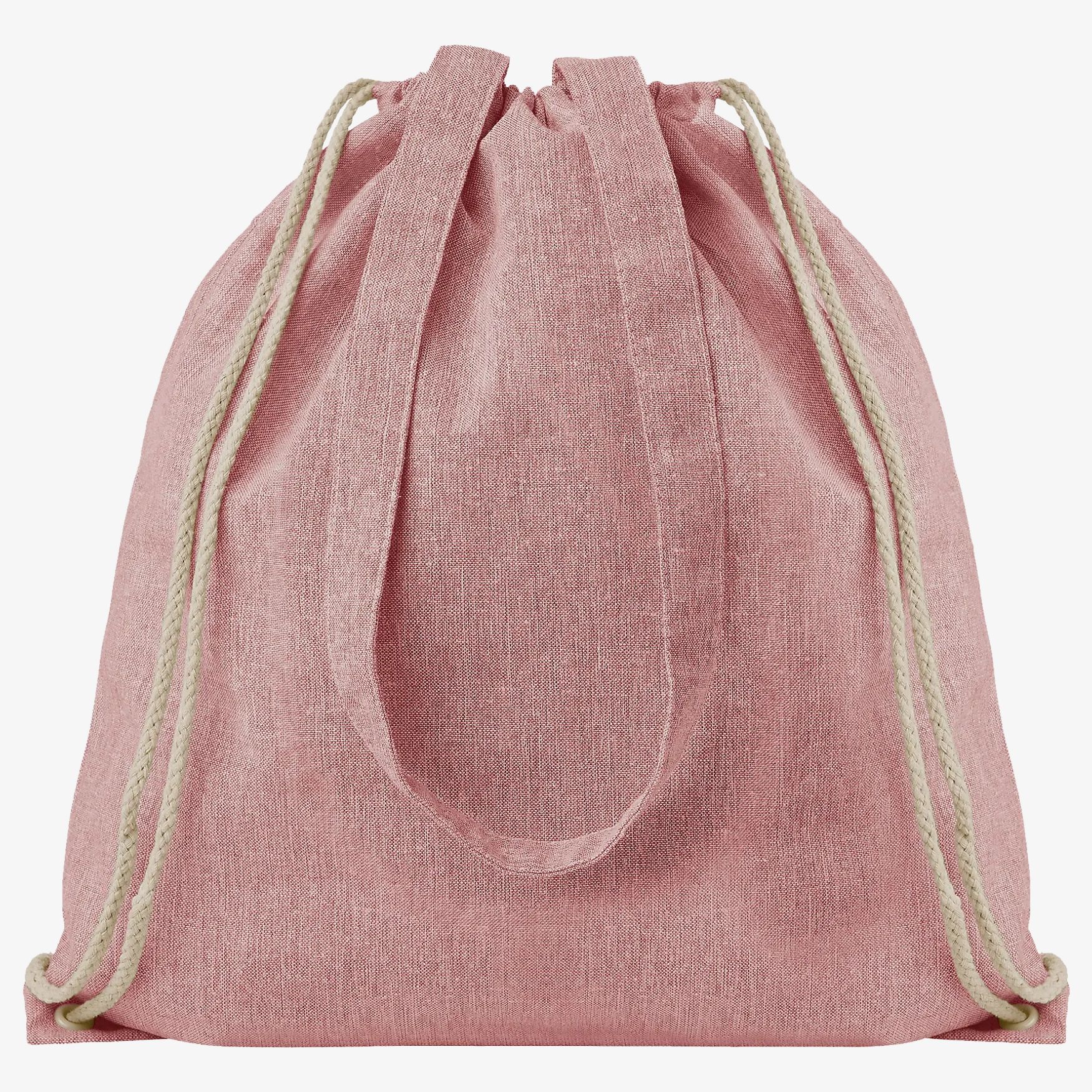 Torba z długimi rączkami w stylu tote bag. Rączki i zamki zapinane w naturalnym kolorze. Około wzmacniające w rogach. Wymiary: 38 x 42 cm. Skład: 80% poliestru recyklingowanego, 16% bawełny recyklingowanej, 2% wiskozy, 2% poliamidu.