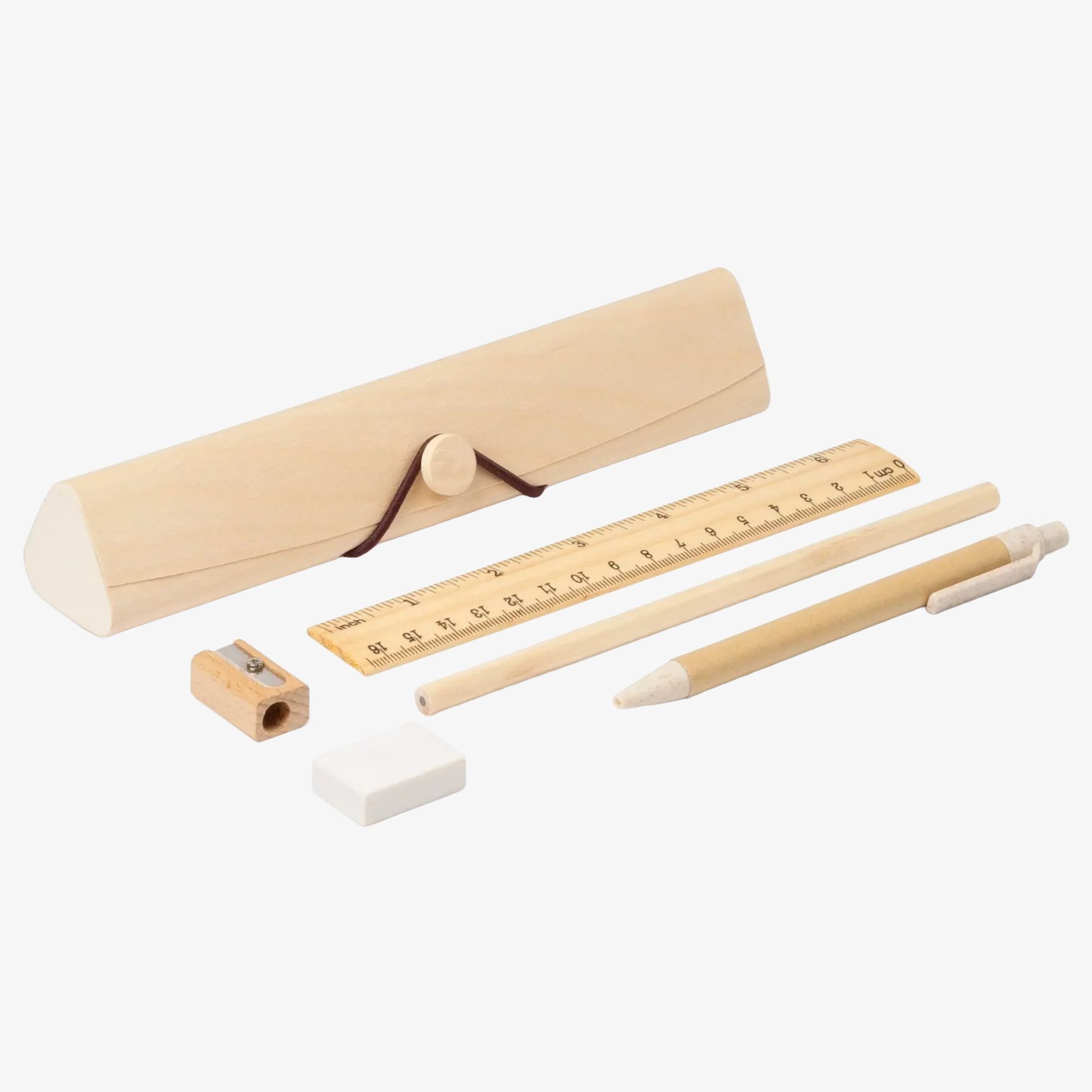 Zestaw do pisania Sakis z naturalnego drewna, w drewnianym pudełku, obejmuje podstawowe akcesoria do pisania i codziennego notowania.