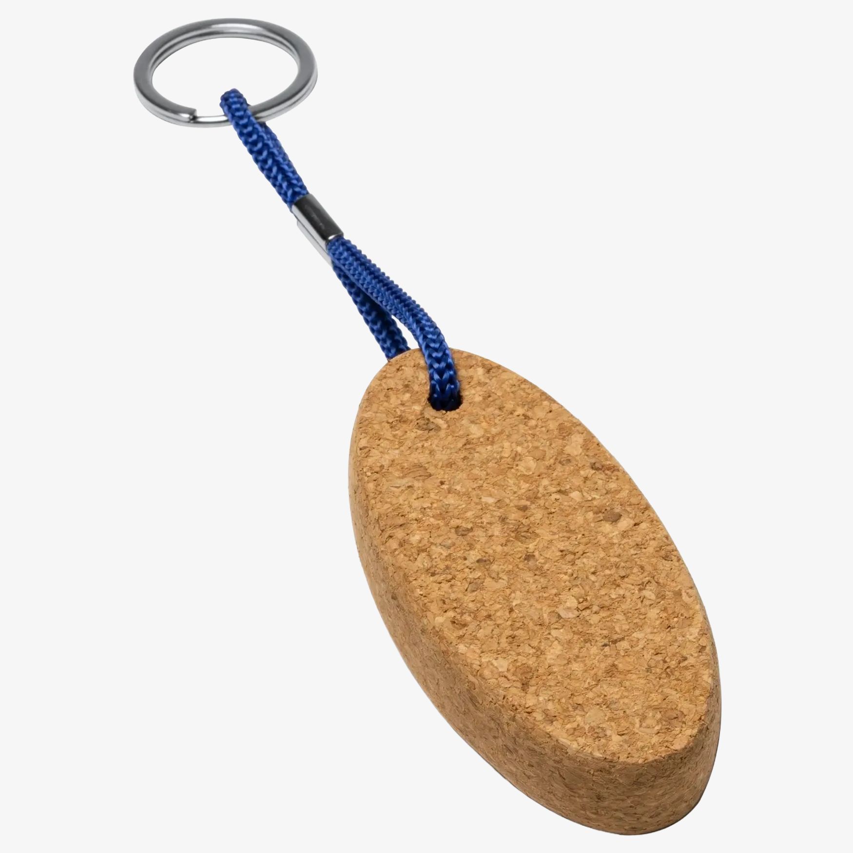 Owalny pływający brelok wykonany z naturalnego korka z wytrzymałym poliestrowym sznurkiem gwarantującym unoszenie się kluczy w przypadku upuszczenia ich do wody. Model odpowiedni do użytku podczas aktywności wodnych lub nad morzem.