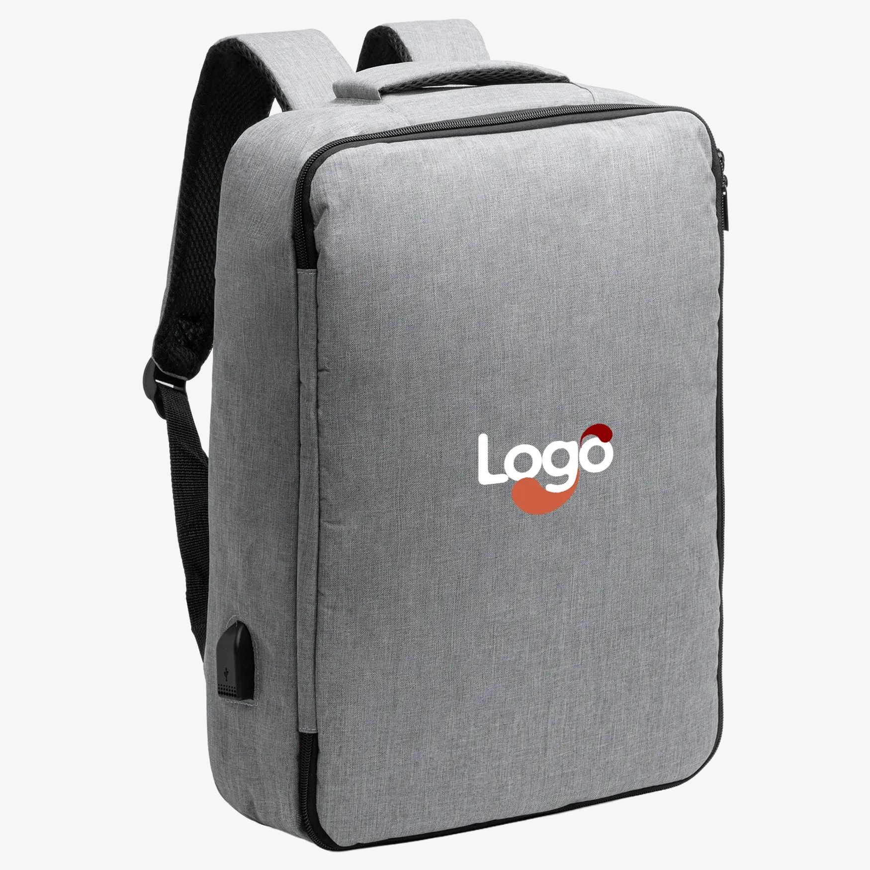 Plecak z recyklingowanego poliestru RPET 300 D posiada główną wyściełaną kieszeń odpowiednią na laptopa lub tablet do 33 cm. Wyposażony w port USB do ładowania urządzeń elektronicznych przez zewnętrzny powerbank. Uchwyt i tył wyściełane dla dłuższego komfortu. Pasek do przytwierdzenia plecaka do walizki na kółkach. Wymiary: 29 x 42 x 10 cm.