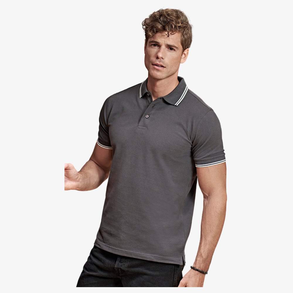 Męskie polo z kontrastującymi kołnierzem i rękawami. Mini piqued mesh. Kontrastujące listewki na kołnierzu i rękawach. Kołnierz z elastanem. Preshrink. Wstążka higieniczna. Plaquetka z trzema guzikami w tym samym kolorze.