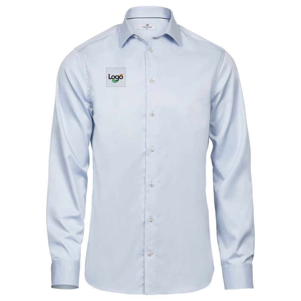 Koszula męska w pasującej tkaninie bawełnianej. Kolar włoski, cięcie slim fit. Kolar i mankiety wbudowane, wstawka na plecach, zapięcia na plecach i zaokrąglony obrzeż. Łatwa w utrzymaniu, ta koszula zapewnia optymalny komfort i elegancki wygląd. Możliwość personalizacji haku pozwala dodać swój logo lub wizualizację dla unikalnego wizerunku marki.