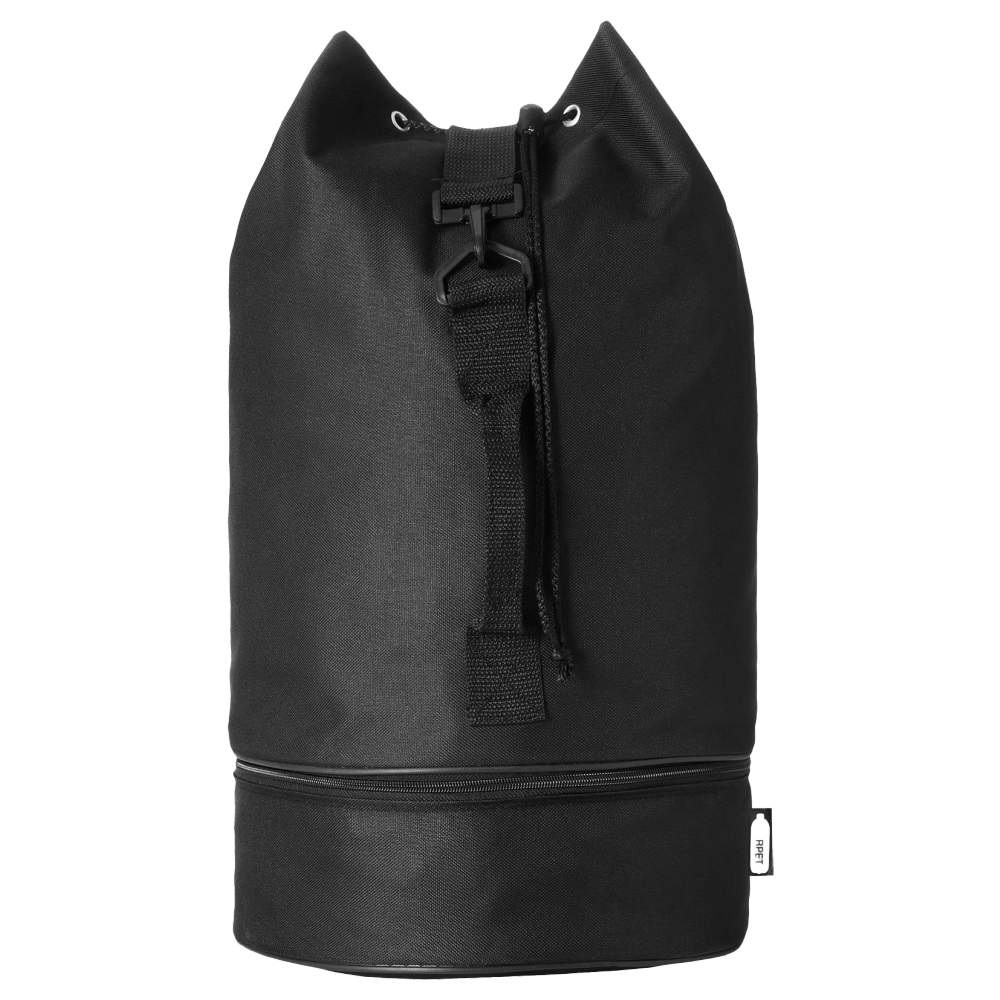Odporny na wodę morski worek podróżny z recyklingu plastikowego PET, z dużym głównym przedziałem o pojemności 35 litrów z zamknięciem sznurkiem, uchwytem bocznym i regulowaną rączką. Zawiera również oddzielony dolny przedział na małe przedmioty z zamkiem błyskawiczym. Wymiary: 48 x 28 cm. Skład: 100% poliestru recyklingowego. Ten worek jest spersonalizowany, ofertuje możliwość wbudowania logo lub wizualizacji dla skutecznej komunikacji marki.