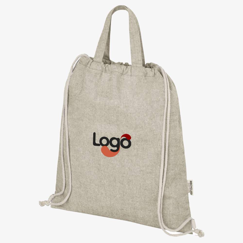 Torebka plecaka ze sznurkiem zamykającym z mieszanki bawełny i poliestru recyklingowanego. Duży główny przedział z zamknięciem sznurem zamykającym w naturalnym kolorze bawełny. Bawełna recyklingowana jest wyprodukowana z odpadów przed-konsumenckich generowanych przez fabryki tekstylne podczas procesu cięcia. Podobne kolory są mieszane ze sobą, co oznacza, że dodatkowe barwniki nie są konieczne. Ze względu na naturę bawełny recyklingowanej może wystąpić niewielka różnica w kolorze. Ta cecha przyczynia się do bardziej autentycznego wyglądu. Każda torebka plecaka jest również wyposażona w śledzik Aware™. Innowacyjna funkcja pozwala użytkownikom śledzić pochodzenie i historię ich przedmiotu za pomocą kodu QR, co zwiększa przejrzystość łańcucha dostaw i wspiera więź między produktem a procesem jego produkcji. Maksymalna pojemność 5 kg. Długość rączki: 14 cm. Wymiary: 38 x 42 cm. Skład: 80% bawełna recyklingowana; 20% poliestr recyklingowany. Torebka plecaka może być personalizowana za pomocą Twojego loga lub wizualu dla efektywnej komunikacji marki.