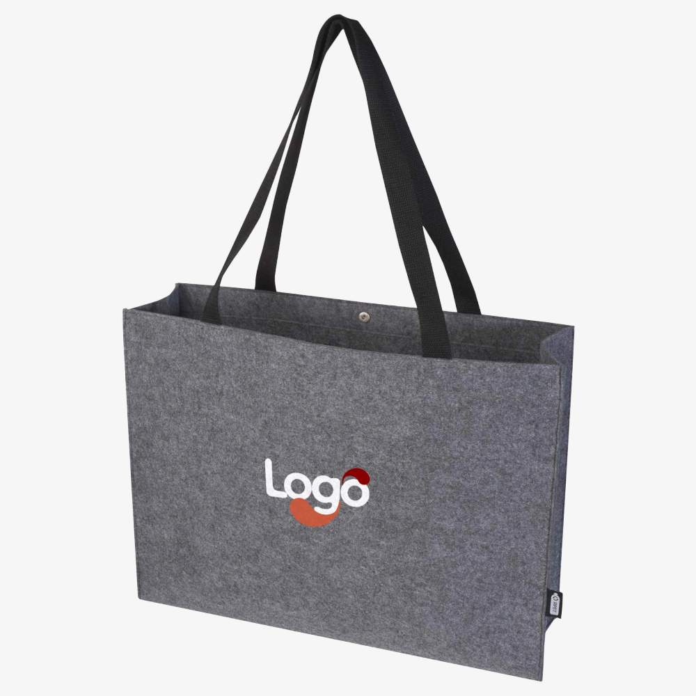 Duża torba zakupowa z fałdami, z miękkiej, trwałej i wysokiej jakości odzyskanej filcu. Torba posiada duży, bardzo przestronny główny przedział (do 20 litrów), wzmocnione uchwyty z tkaniny bawełnianej (30 x 2,5 cm) dla optymalnego komfortu noszenia oraz guzik zamknięcia na wierzchu. Wymiary: 45 x 14 x 33 cm. Skład: 100% odzyskanego poliestru. Ta torba jest personalizowalna haftem dla skutecznej i trwałej komunikacji.