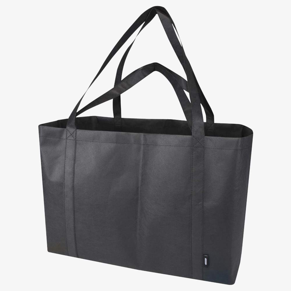 Torba na zakupy Jumbo recyklingowana o pojemności 65 litrów dla różnych aktywności. Wyprodukowana z trwałego i odpornego na rozrywanie RPET nie tkaniny. Wzmocnione krótkie (24cm) i długie (37cm) rękojeści do maksymalnego komfortu transportu. Łatwa w składaniu i przechowywania, gdy nie jest używana. Maksymalna nośność 15 kg. Wymiary: 52 x 38 x 35 cm. Skład: recyklingowany poliestr.