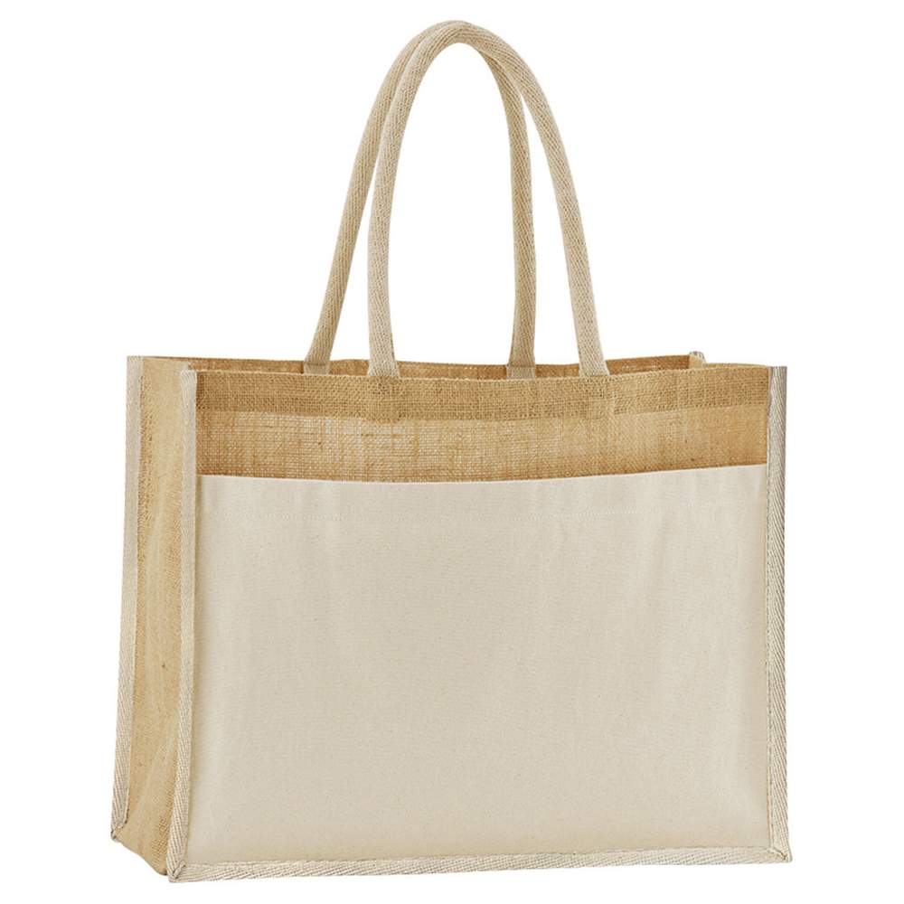 Ta torebka z kieszonką z naturalnego wybielonego juta oferuje praktyczne i trwałe rozwiązanie do codziennego transportu. Jej solidna konstrukcja i czysty design czynią z niej wszechstronny akcesorium, idealne do zakupów, podróży lub pracy. Przednia kieszeń z 100% organicznego bawełnianego materiału umożliwia umieszczanie dekoracji drukowanych lub personalizowanego loga. Rękojeści z bawełny zapewniają komfortne noszenie. Model ten jest również dostępny w bardziej kompaktowym formacie (W483). Wymiary: 42 x 33 x 19 cm. Pojemność: 21 litrów. Odłączalna etykieta. Skład: 100% naturalnego, nieplastyfikowanego juta. Przednia kieszeń 100% bawełniany materiał. Możliwość personalizacji haftem.