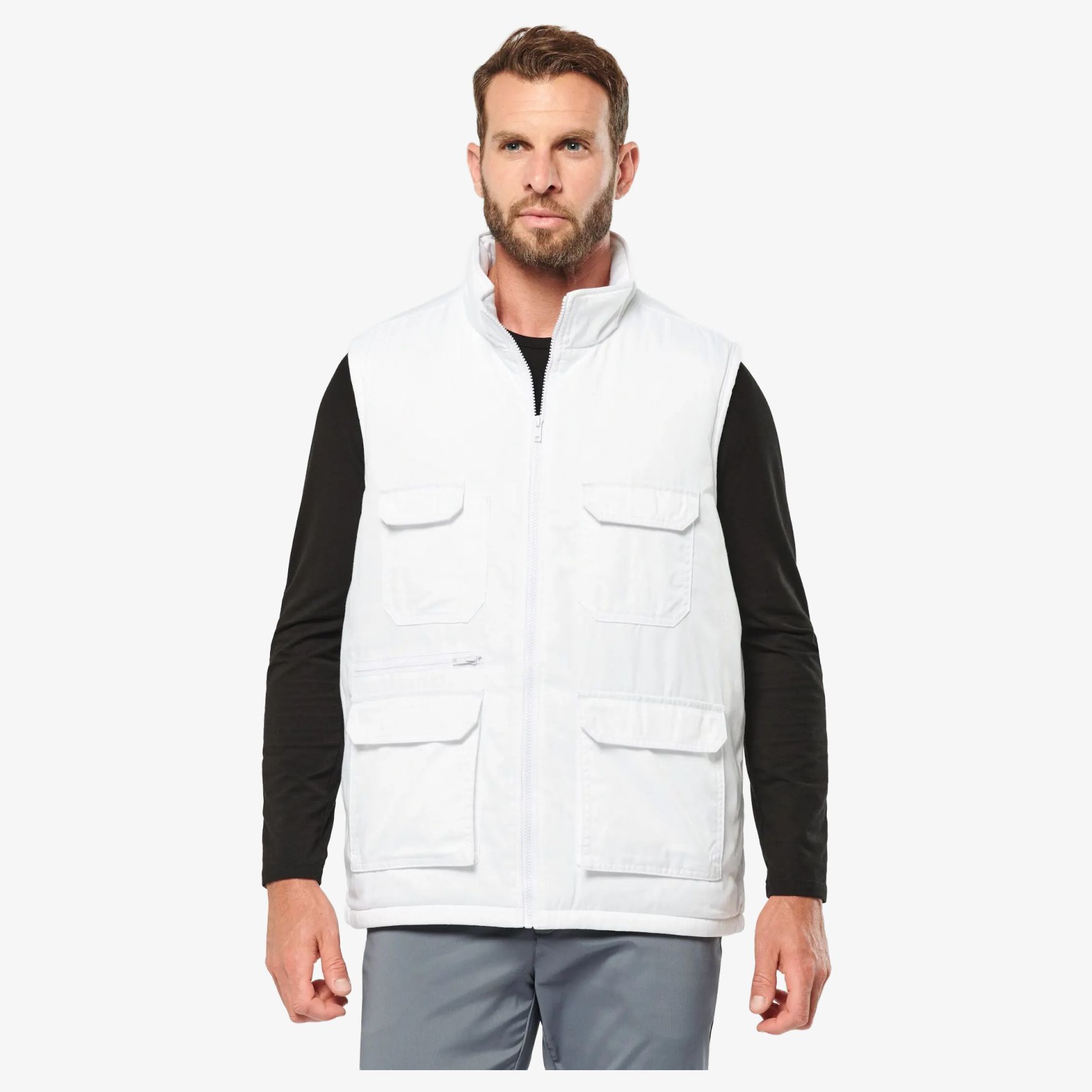Kurtka poliesterowa z wieloma kieszeniami. Dopasowana krojoność dla optymalnego komfortu. Ta kurtka posiada 2 duże kieszenie przyczepiane z klapką z taśmą samoczepną i otworem bocznym, a także 2 kieszenie na piersiach przyczepione z klapką z taśmą samoczepną, w tym jedna z otwartym kompartementem dla pisaka. Ponadto zawiera 1 kieszeń z plastikowym zamkiem błyskawicznym ton w ton przedni bok prawy i 1 wewnętrzną kieszeń z klapką z taśmą samoczepną po stronie serca. Zamykana jest plastikowym zamkiem błyskawicznym ton w ton, a wewnątrz krawata do zawieszania na kołnierzu jest obecny. Tył wydłużono dla większej ochrony, a niewidoczny zamek błyskawiczny do personalizacji znajduje się u dołu ubrania. Etykieta marki Tear Away.