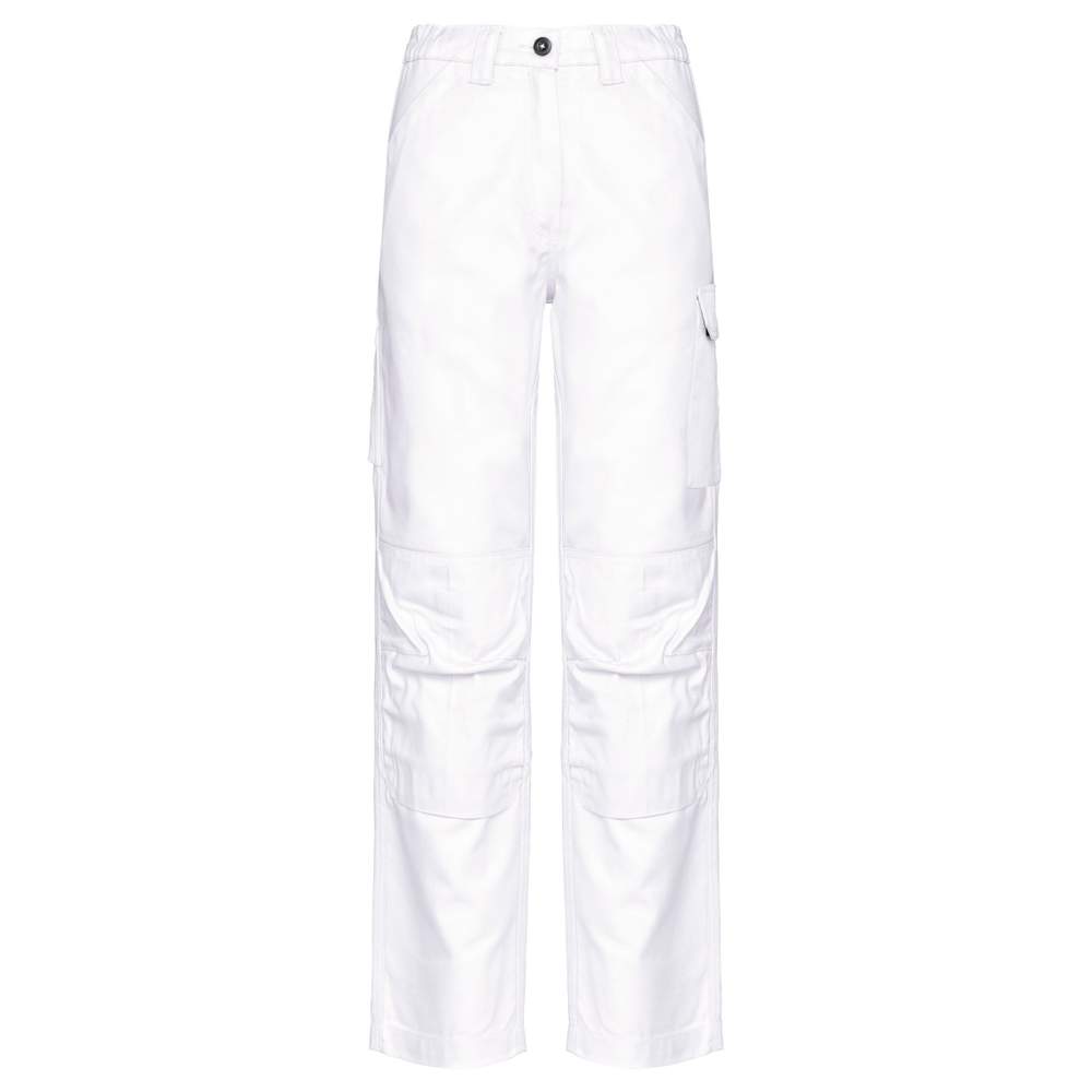 Spodnie robocze z wieloma kieszeniami dla kobiet. Wykonane z tkaniny serża, te spodnie oferują dużą wytrzymałość i optymalny komfort. Ich prosty kroju i opaska częściowo elastyczna z paskami zapewniają wygodne dopasowanie. Dysponuje 2 kieszeniami przednimi, jedną kieszenią z klapką zamkniętą na bandaż samoczepny, podwójną kieszenią narzędziową, dwiema kieszeniami tylnymi i dwoma kieszeniami kolanowymi z bandażem samoczepnym i wewnętrzną klapką. Zamknięcie na zamek błyskawiczny i plastikowy guzik zapewniają bezpieczne zamknięcie. Rozszerzalny element w rozstępu zwiększa swobodę ruchu, a podwójne szwy na bocznych szwach, potrójne szwy na rozszerzalnym elemencie i rozstawie wzmocniają trwałość spodni.