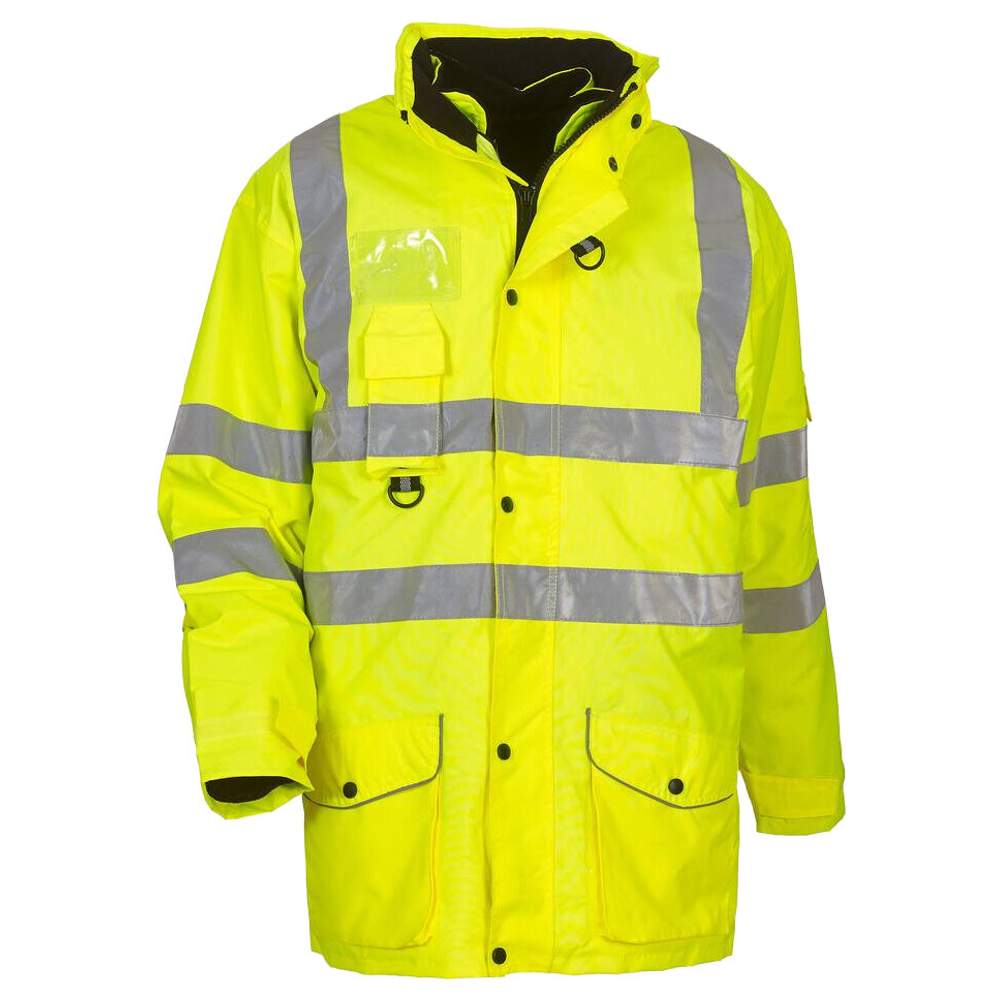 Ta kurtka bezpieczeństwa o wysokiej widoczności 7 w 1 zapewnia skuteczną ochronę przed niepogodą. Jej konstrukcja łączy wodoodporną i przewiewną kurtkę zewnętrzną z poliestru Oxford z powłoką PU 300D i podszewkę z siateczki. Wszystkie szwy są całkowicie zszyte i sklejone, co zapewnia optymalną szczelność. Ma dwa zewnętrzne kieszenie na ręce i odłączalną kaptur, który można schować. Na piersiach znajdują się kieszenie na telefon komórkowy i dokumenty. Kurtka wewnętrzna, przymocowana z zamkiem błyskawicznym, jest matowana i odwracalna w czerni. Ma zdejmowane rękawy dla większej wszechstronności. Ten ubiór spełnia normę EN ISO20471:2013 kategoria 3.