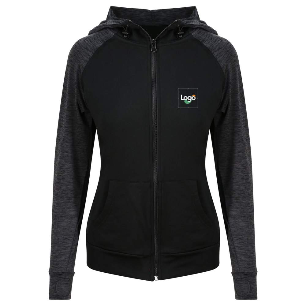 Quando as noites ficam frias ou se você quer vestir um moletom com capuz bem quente para sua viagem até a academia, o moletom com capuz zíperado para mulheres combina propriedades de evaporação do suor com um tecido ligeiramente texturizado no corpo. A capuz com cordão ajustável protege você dos elementos, enquanto as mangas raglan e os passantes para os polegares proporcionam grande liberdade de movimento. Mangas e corpo em tecido contrastante. Esta peça é personalizável em bordado para integrar seu logotipo ou seu visual.