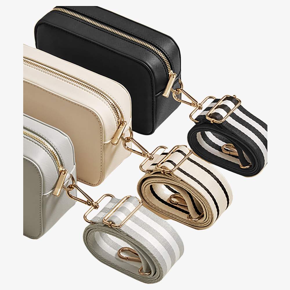 Esta alça ajustável é projetada para ser associada a envelopes ou necessaires. É fabricada em poliéster de alta densidade para uma boa resistência e durabilidade. As guarnições metálicas douradas adicionam um toque estético. Esta alça é compatível com os modelos BG758 e BG760, oferecendo uma solução prática e adaptável. Projetada para facilitar o transporte ou a fixação de acessórios, representa um complemento útil para diversos usos.