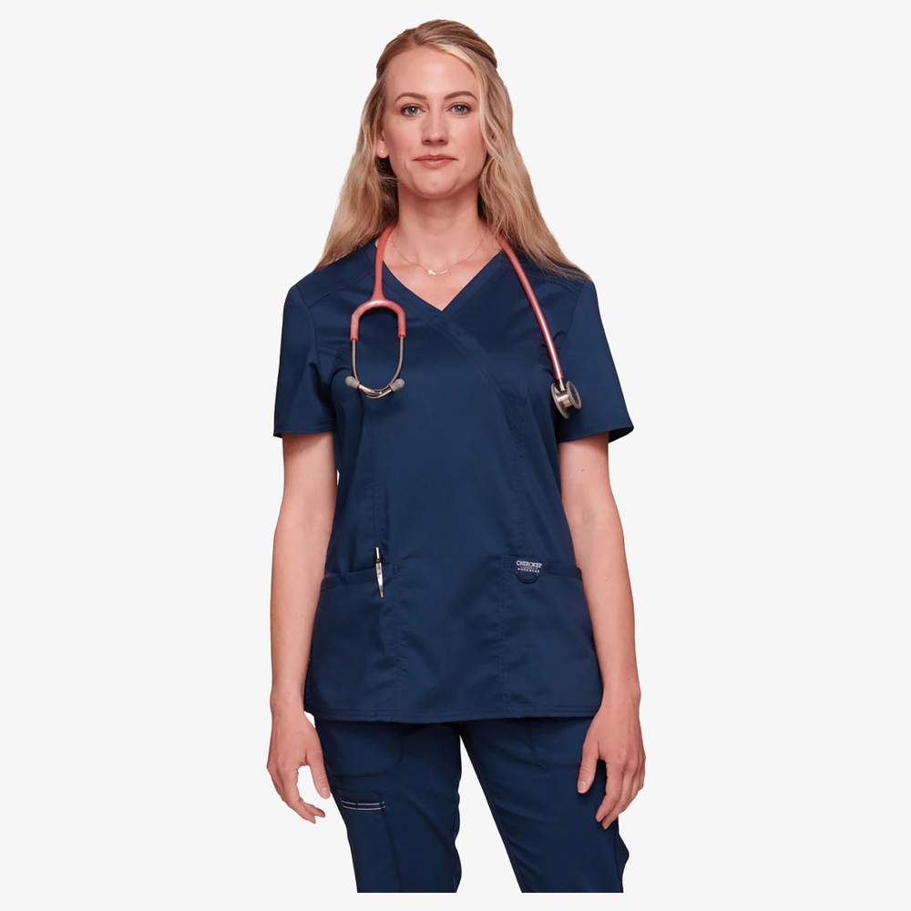 Blusa de trabalho de manga curta para mulher. Colar em V cache-coração cruzado oferecendo um corte descontraído, clássico e moderno. Ela possui dois bolsos aplainados na frente para fácil acesso a pequenos objetos. Laços de instrumentos escondidos são integrados para uma funcionalidade aumentada. Uma etiqueta do logotipo com alça elástica garante um ajuste confortável. Remendos nos ombros frontais melhoram o ajuste e o conforto. Ventilações laterais promovem a circulação do ar. O tecido sarja oferece maior durabilidade.