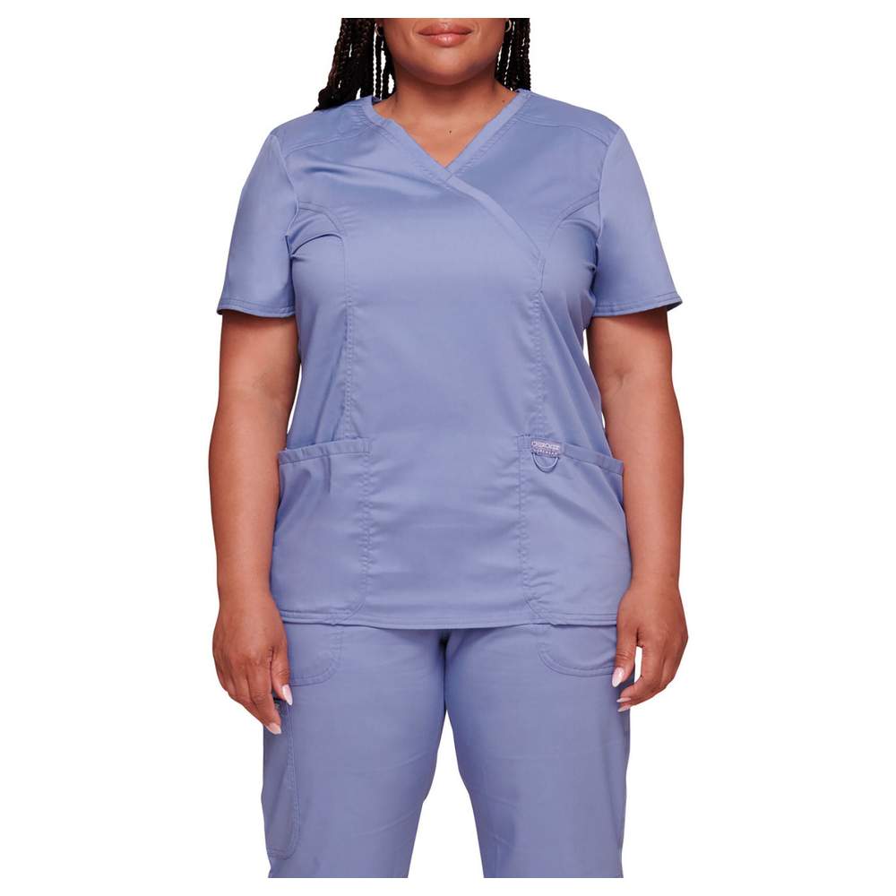 Blusa de trabalho de manga curta para mulher. Colar em V cache-coração cruzado oferecendo um corte descontraído, clássico e moderno. Ela possui dois bolsos aplainados na frente para fácil acesso a pequenos objetos. Laços de instrumentos escondidos são integrados para uma funcionalidade aumentada. Uma etiqueta do logotipo com alça elástica garante um ajuste confortável. Remendos nos ombros frontais melhoram o ajuste e o conforto. Ventilações laterais promovem a circulação do ar. O tecido sarja oferece maior durabilidade.