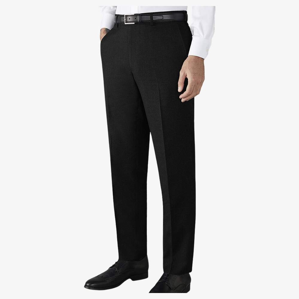 Calça de terno para homem, corte ajustado. Modelo clássico com passantes para cinto e dois bolsos laterais funcionais. Confeccionada em mistura de poliéster reciclado certificado GRS e viscose, esta calça oferece conforto e suporte. É adequada para diversas ocasiões formais e profissionais. Esta calça se destaca por seu design cuidadoso e acabamentos de qualidade.