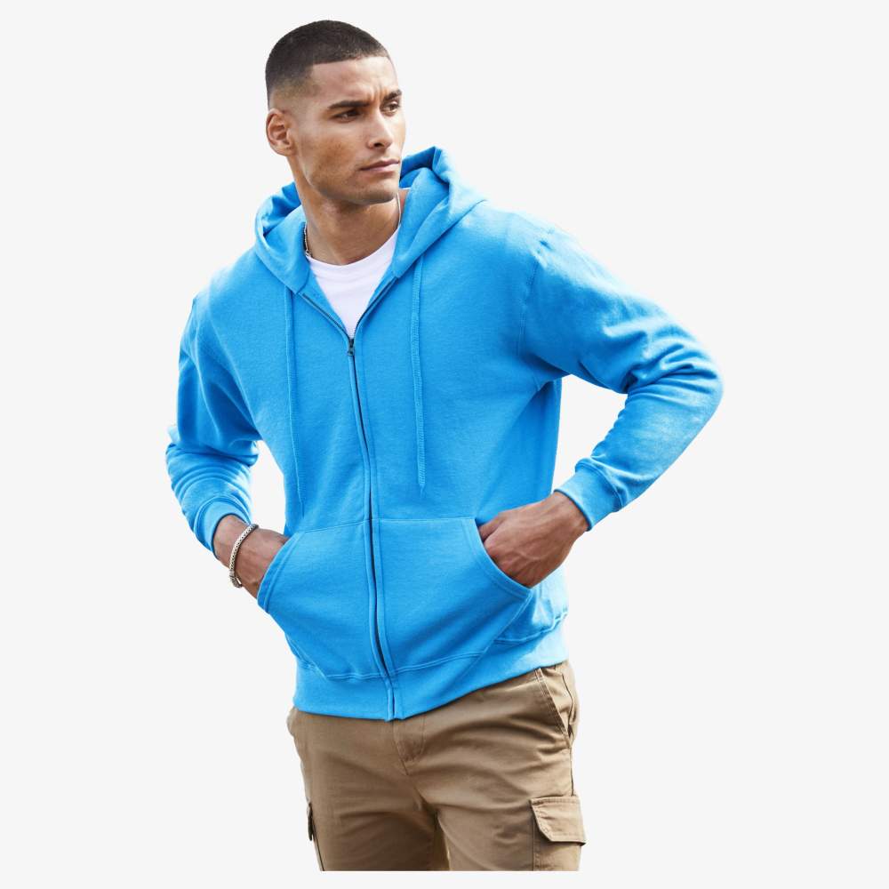 Este moletom zíperado clássico da FRUIT OF THE LOOM é confeccionado em algodão e poliéster para um conforto ótimo. Ele apresenta um corte clássico com capuz forrado e zíper estreito invisível. Possui dois bolsos kanguru práticos e punhos e cintura em rib para um ajuste seguro.