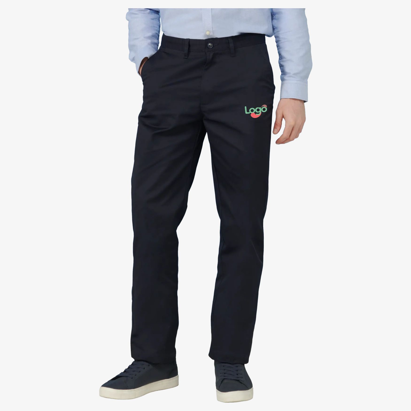 Esta calça chino é confeccionada em uma mistura de 65% poliéster e 35% algodão, oferecendo um equilíbrio entre conforto e durabilidade. Seu corte reto clássico garante uma silhueta elegante e liberdade de movimento ótima. Ela possui duas bolsas traseiras práticas, fechadas por um botão, para guardar seus pertences com segurança. Esta calça é uma base versátil para muitas roupas, adequadas para o trabalho e para o lazer. É possível personalizar este artigo com seu logotipo ou visual, para uma comunicação eficaz e uma imagem de marca consistente.