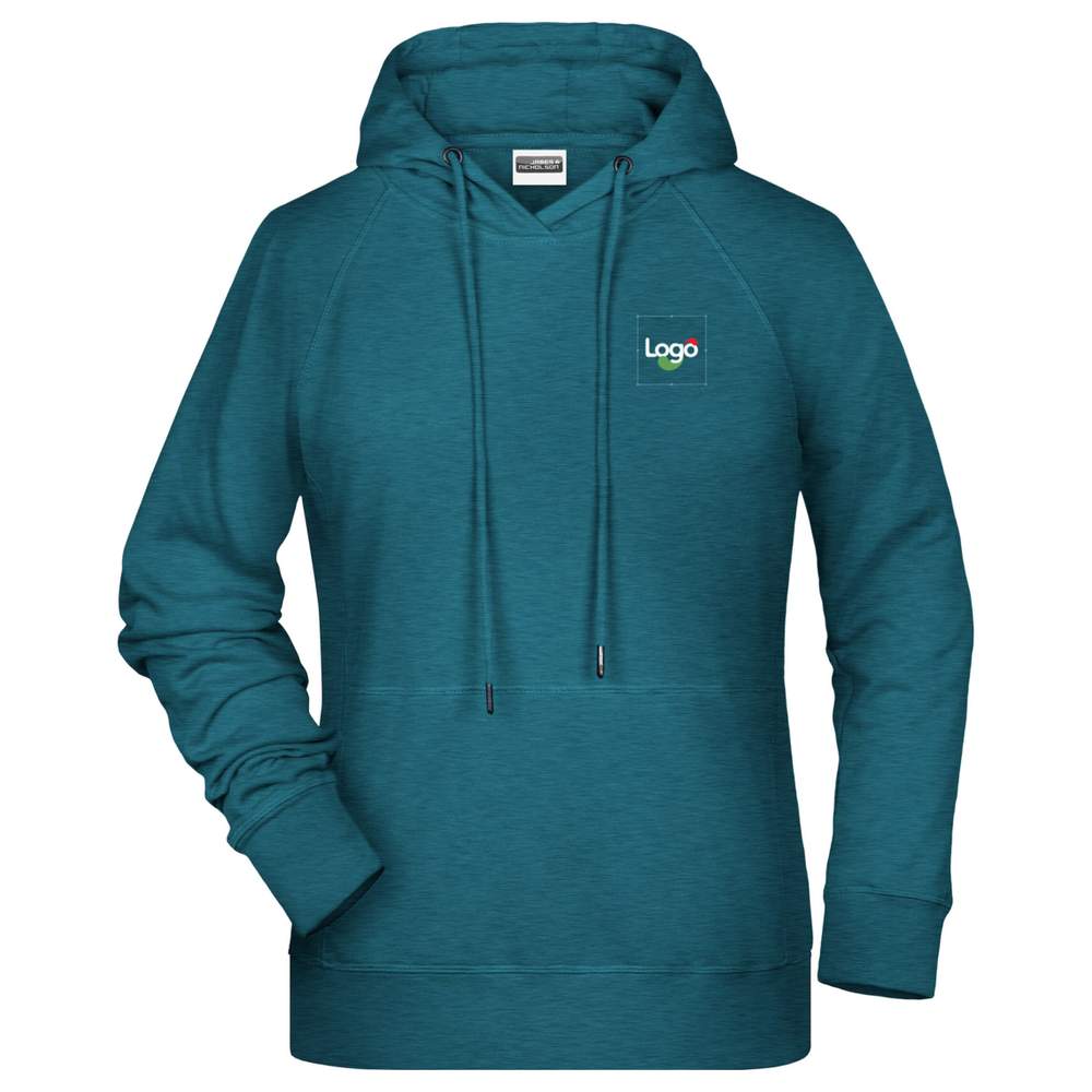 Camisa de moletom com capuz para mulher, ligeiramente ajustada, com mangas raglan. Tecido anti-transpiração de alta qualidade, interior macio. 85% algodão orgânico fio penteado. Possui capuz de dupla camada com cordão de aperto, costuras laterais na frente e bolso kanguru. Punhos com elastano. Etiqueta destacável. Composição: 85% algodão, 15% poliéster. Este moletom com capuz oferece uma excelente base para personalização em bordado, permitindo adicionar seu logotipo, uma imagem ou qualquer outro elemento gráfico para uma comunicação eficaz.