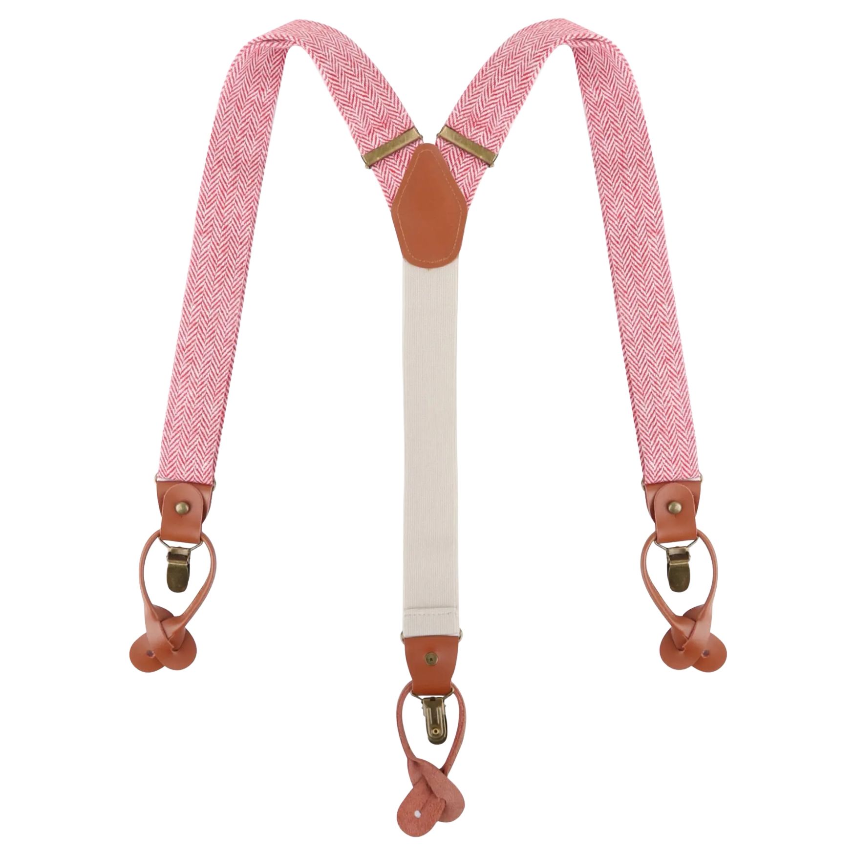 Os suspenders urban-herringbone apresentam padrão espinha de peixe e são fabricados com tiras elásticas e presilhas metálicas permitindo ajustar o comprimento. A fixação é feita por fivelas de couro legítimo para botões ou por clipes metálicos para fixação rápida. O formato Y contém duas tiras na frente e uma atrás.