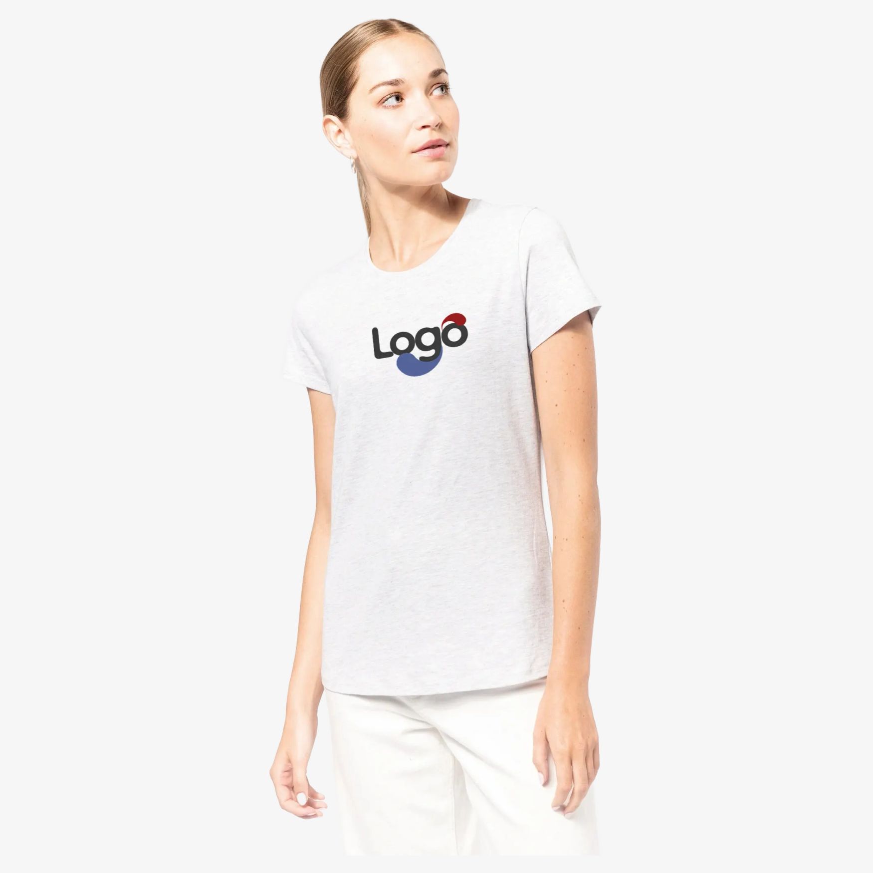 Esta camiseta mulher em algodão oferece um corte ajustado e conforto ótimo. Sua faixa de limpeza contrastante cinza chiné (ou branca no branco) traz um toque de elegância. Os acabamentos de costura dupla na base das mangas e da peça garantem maior durabilidade. Ideal para uma personalização fácil e eficaz, esta camiseta é perfeita para exibir seu logotipo ou visual.