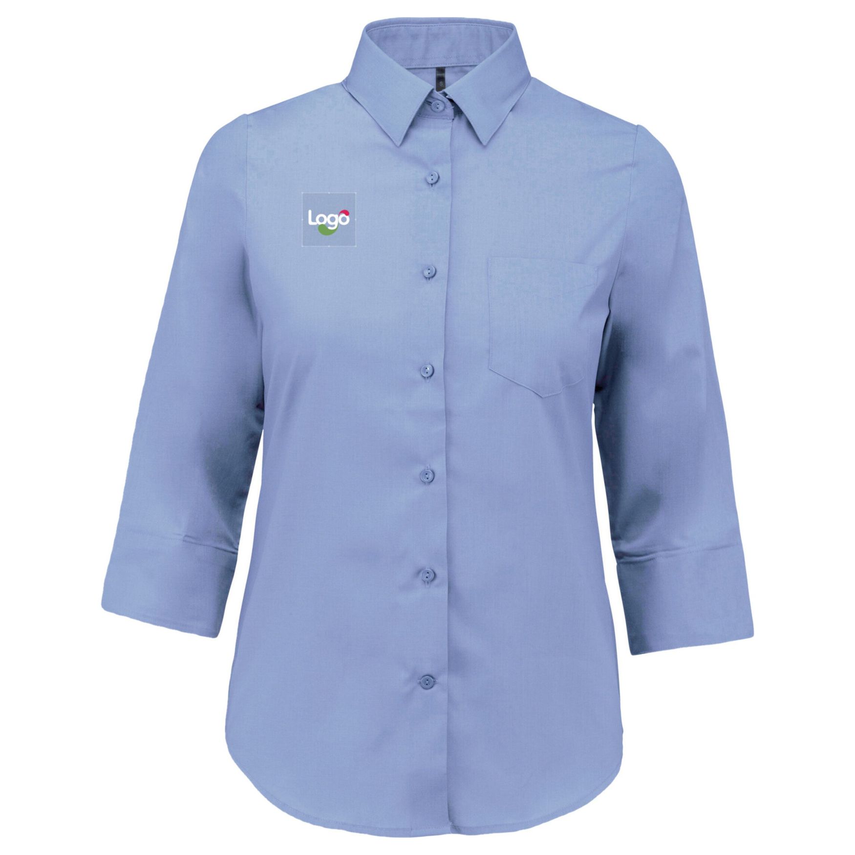 Esta camisa de mangas três quartos para mulher é confeccionada em 65% poliéster e 35% algodão poppelinet, garantindo uma fácil manutenção. Ela apresenta um colar sem botões, botões na mesma cor e um bolso no peito do lado esquerdo em V, adornado com um único botão de lembrança. A base arredondada traz um toque de modernidade.
