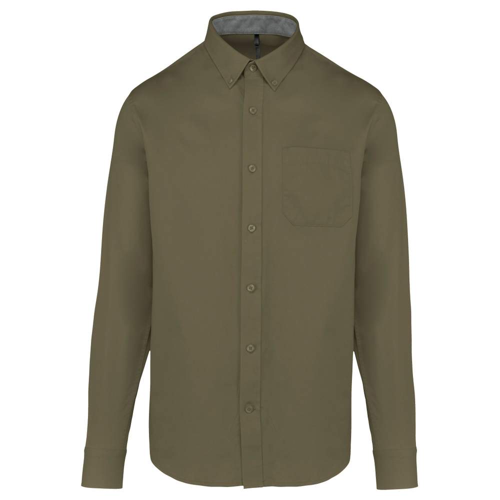 Esta camisa masculina KARIBAN é confeccionada em 100% algodão sarja, oferecendo um toque suave e agradável. Ela apresenta um corte clássico com uma ponta de colarinho abotoado, botões do mesmo tom e um bolso no peito. O interior da base do colarinho e dos punhos é contrastante na cor Oxford prateada. As costas possuem 2 pregas de conforto e uma peça costurada dobrável para melhor conforto e caimento. As costuras rebatidas e o punho ajustável com aba de manga capuz abotoada proporcionam um acabamento refinado.