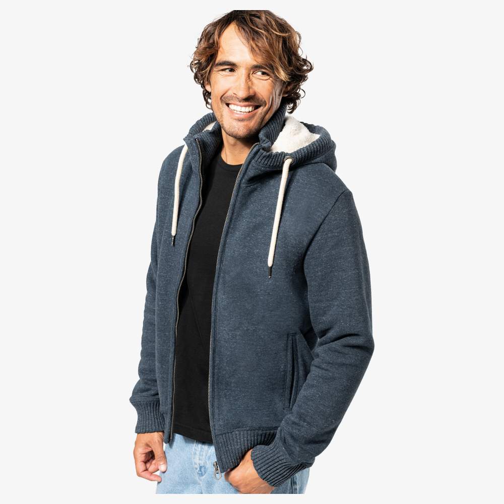 Jaqueta vintage em malha macia e confortável, forrada de sherpa para um aporte de calor ótimo. Confeccionada em 80% algodão e 20% poliéster, esta jaqueta oferece um toque agradável e boa resistência. Ela é equipada com dois bolsos com viés na frente e se fecha graças a um zíper metálico. As barras de costura 4x4 no colarinho, arredondamento do capuz, punhos e parte inferior da roupa garantem um ajuste ótimo. Uma abertura zíper invisível do lado do coração e uma costura do lado esquerdo facilitam o acesso para a personalização com bordado. Este produto passou por um tratamento especial para lhe dar um aspecto envelhecido, o que pode causar variações de cores e tornar cada peça única. A ausência de etiqueta de marca permite uma personalização ótima. Esta jaqueta é ideal para exibir seu logo ou seu visual.