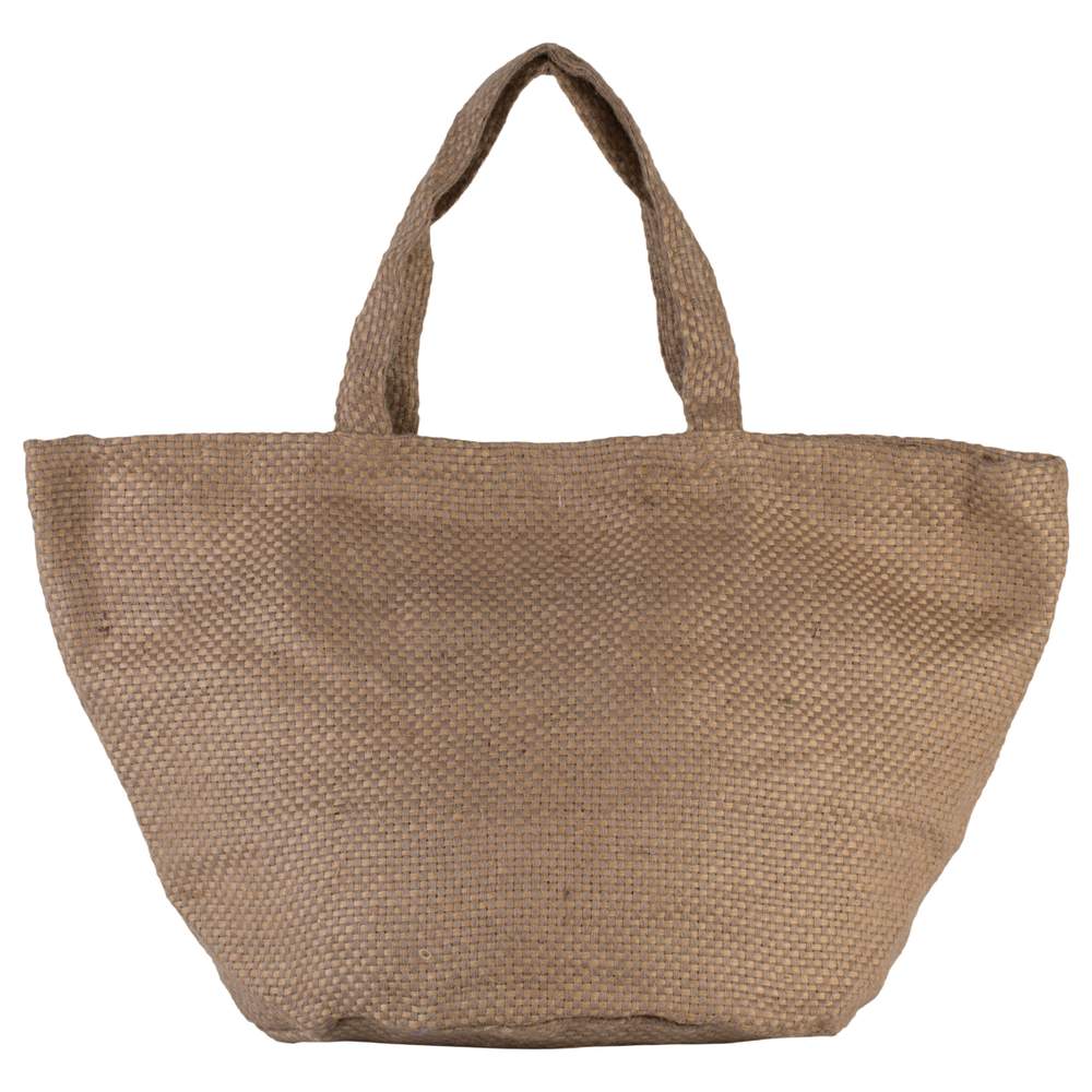 Saco tipo cesta em pano de juta com fio tecido-tingido e alças curtas na mesma matéria. Possui um bolso interior com zíper. Este saco é concebido a partir de materiais 100% ecológicos, biodegradáveis e naturais. Suas dimensões são de 36 x 59 x 29 cm.