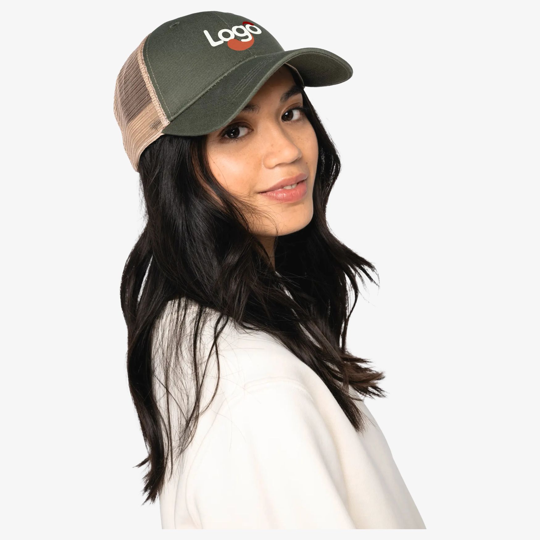 O boné 6 painéis unissex inclui uma pala em algodão orgânico e painéis traseiros em poliéster reciclado. Está equipado com uma tira de aperto em plástico reciclado na parte traseira para ajustar o tamanho. O tecido twill mesh compõe os painéis traseiros enquanto o acabamento interior é cuidado com uma virola. O produto é totalmente personalizável conforme as necessidades.