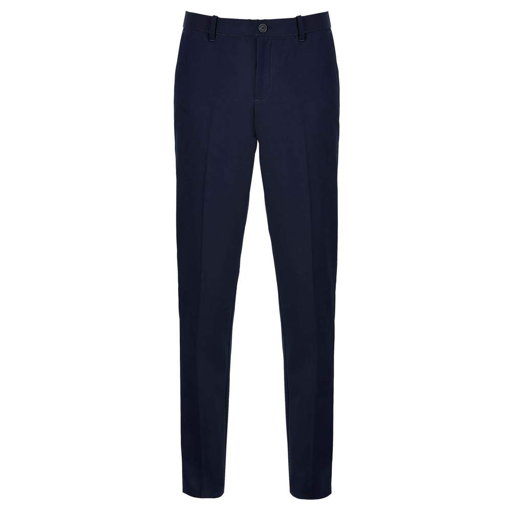 Calça de fato masculina com cintura elástica. Fecho éclair e botão, passadores de cinto. Fita de cintura elástica. 2 bolsos frontais italianos, 2 bolsos traseiros com costura, 2 pregas traseiras. Fabricado em Twill 204, composto por 66% de poliéster e 34% de viscose.