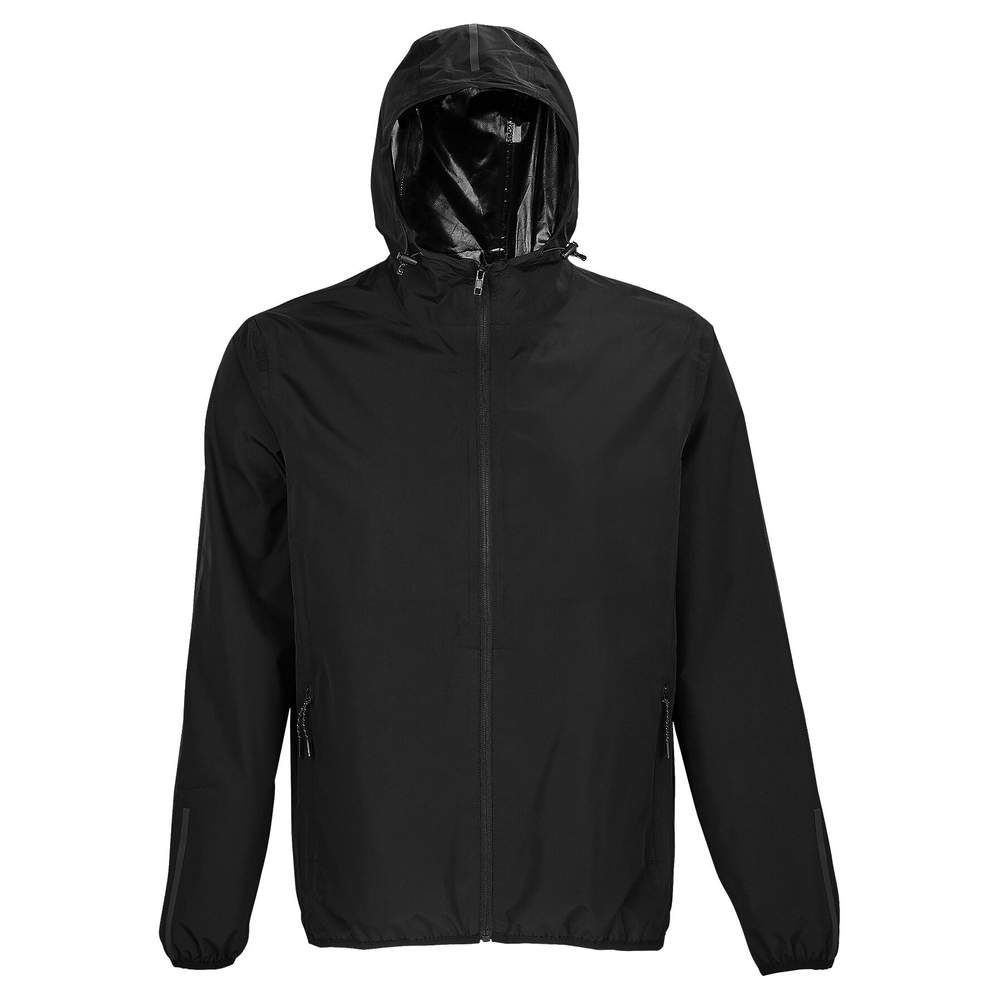 Jaqueta corta-impermeável unissex, projetada para proteger contra intempéries durante suas atividades ao ar livre. Possui zíper de nylon, bolsos laterais com zíper e costuras seladas para máxima estanqueidade. Cordão elástico na capuz e punhos e bainha do tecido elásticos garantem um ajuste confortável.