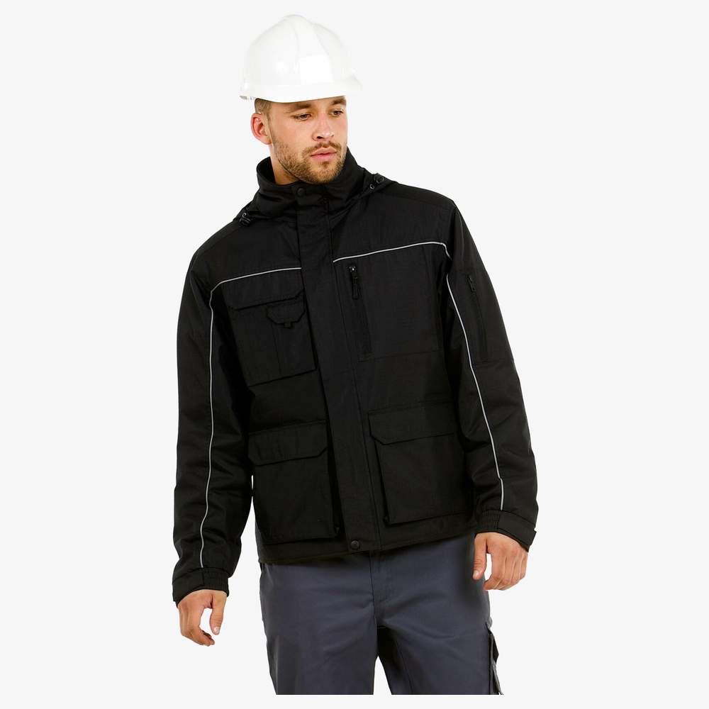 Jaqueta grossa altamente funcional. Ela integra um capuz ergonômico no colarinho. Ela possui 12 bolsos multifuncionais. As costas são mais longas para maior liberdade de movimento e proteção aumentada na posição ajoelhada ou inclinada. Uma barra refletora está presente na frente e nas costas para melhor visibilidade e segurança. A camada exterior rip-stop aumenta a resistência ao desgaste e aos rasgões. Ela inclui um bolso para smartphone no exterior com fechamento por fita autoadesiva, bem como três bolsos adicionais para canetas. Ela possui duas entradas duplas com acesso lateral aos bolsos aquecedores de mãos em polar e um bolso carteira fixo no interior. Um bolso no braço é dotado de um zíper. As alças são ergonômicas para fácil acesso. Os punhos ajustáveis são equipados com abas por fita autoadesiva para um ajuste ótimo. O tecido é testado para todas as técnicas de bordado e impressão.