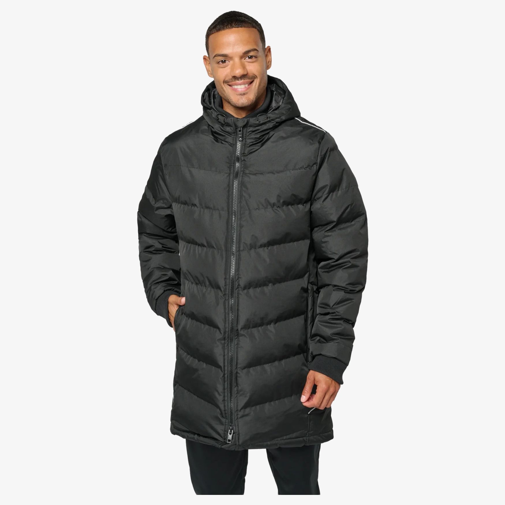 Este jacket esportivo de equipe é confeccionado em poliéster com uma camada de PVC para uma proteção aumentada. Oferece um forro interno em poliéster para um conforto ótimo. Possui dois bolsos laterais com zíper, um bolso interno e um capuz forrado. O colarinho e as mangas com acabamento em borda-côte garantem uma boa modelagem. Bies refletivos estão presentes nos ombros e nos lados para uma visibilidade aumentada.