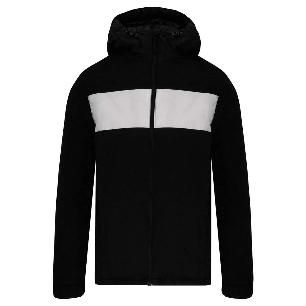 Esta jaqueta de clube unissex é projetada em poliéster acolchoado com tratamento repelente para uma proteção aprimorada. Ela apresenta um capuz em 3 partes acolchoado com stoppeurs para um ajuste personalizado. Ela dispõe de dois bolsos com zíper ocultos nos lados e um bolso interior acolchoado para armazenamento prático. Uma faixa contrastante na frente adiciona um toque visual. As mangas semi-elásticas garantem conforto ótimo. Um zíper central na frente e um zíper na parte inferior da peça permitem acesso fácil para personalização. O interior da jaqueta inclui uma etiqueta para indicar o nome do portador.