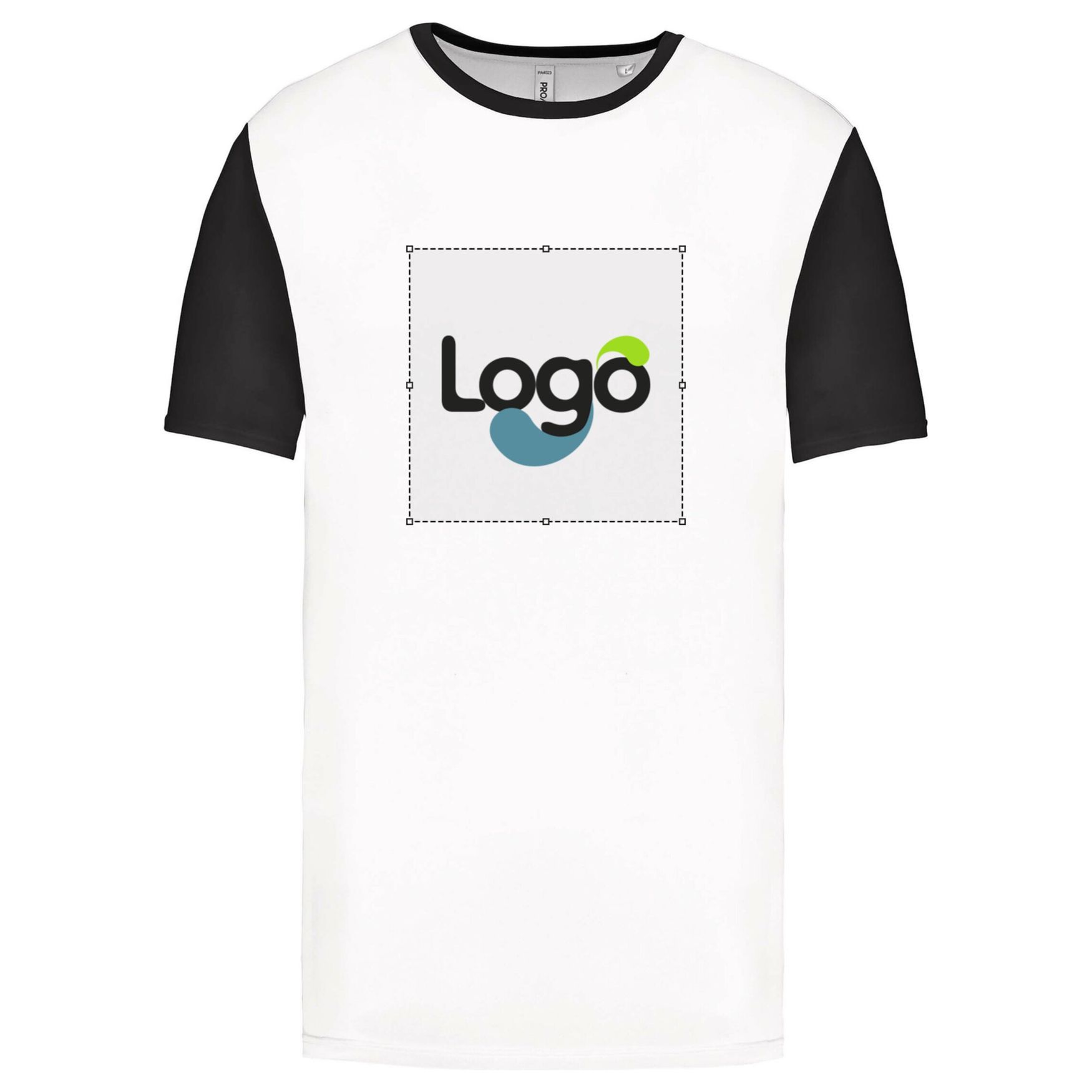 Camisa de manga curta esportiva para adulto. Modelo unissex e bicolor. Malha interlock para um conforto ótimo. Corte direito clássico. Gola redonda contrastada com banda de limpeza para uma melhor sustentação. Mangas retas contrastadas para um visual dinâmico. Acabamentos de dupla agulha na base das mangas e do vestido para uma durabilidade aumentada. Essa camisa oferece excelente respirabilidade e grande liberdade de movimento, ideal para suas atividades esportivas. Possibilidade de personalização com seu logo, visual ou texto para uma visibilidade máxima de sua marca.
