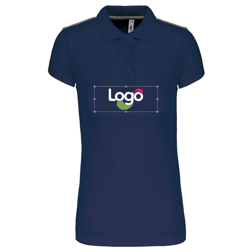 Camisa polo manga curta mulher em 100% poliéster interlock, oferecendo secagem rápida. Ela apresenta um colarinho em borda costeada e uma aba de botões com 3 botões. Uma faixa de proteção contrastante adornando a gola e as aberturas laterais, enquanto passamanaria contrastante embelezam os ombros. Os acabamentos incluem costuras duplas na base das mangas. Esta camisa polo é projetada para ser personalizada, permitindo a adição de logos ou visuais através de bordado.