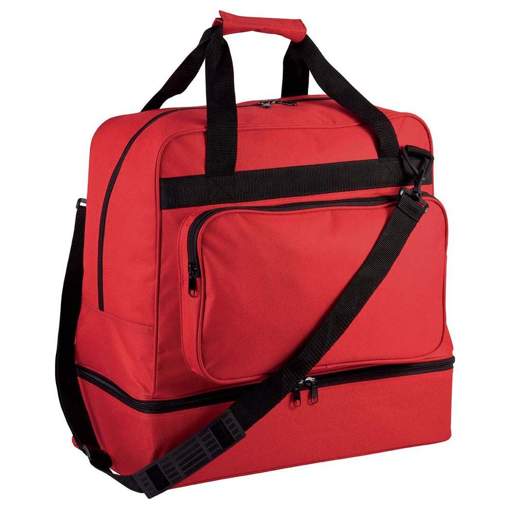 Sacola esportiva com capacidade de 60 litros, fabricada em poliéster 600D para boa resistência. É equipada com uma base rígida removível em polipropileno, garantindo maior estabilidade e protegendo o conteúdo. A base rígida possui pés de plástico para evitar o contato direto com o solo. Um bolso zíperado na frente permite acesso fácil aos itens pessoais e oferece a possibilidade de personalizar a sacola. Uma alça de ombro removível com almofada de silicone garante um porte confortável. A base rígida está incluída com a sacola.