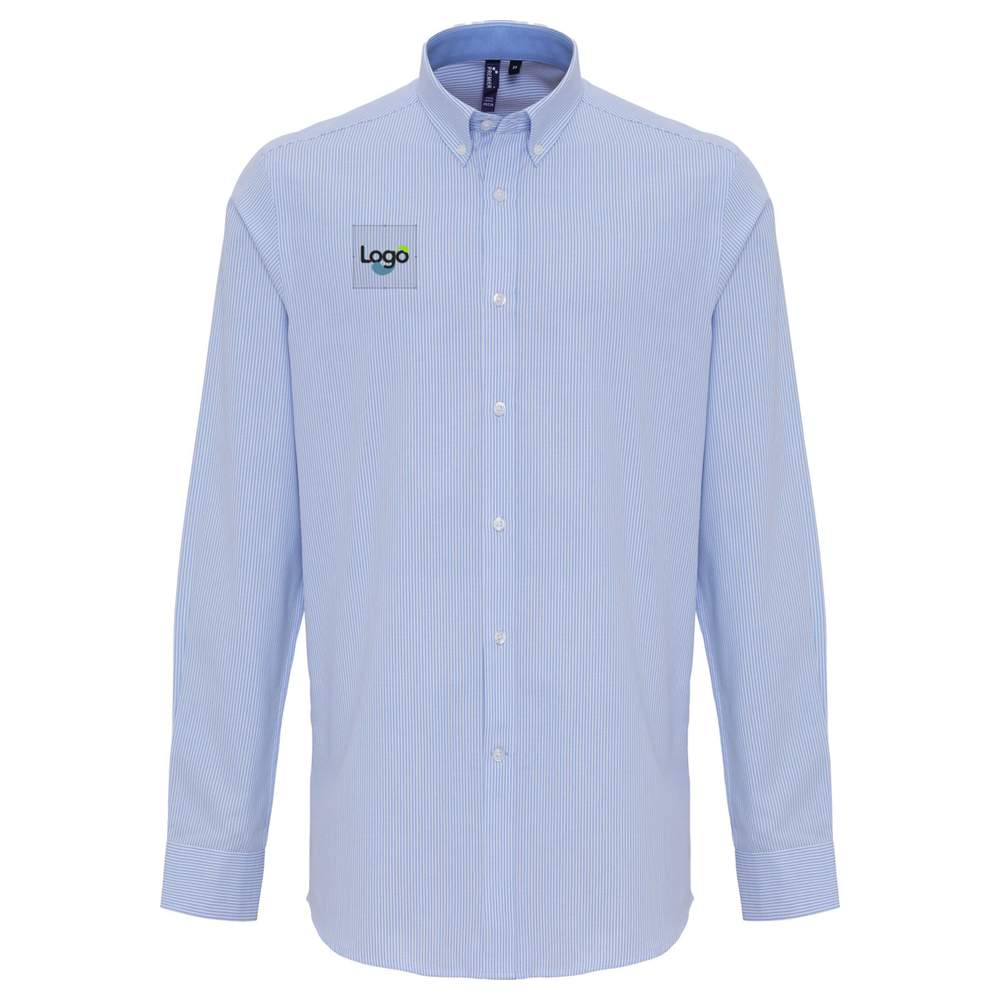 Camisa de finas listras para homem, confeccionada em algodão e poliéster. Ela apresenta uma gola abotoada clássica, botões nos punhos e uma bainha curvada. Este modelo oferece conforto ótimo e um visual cuidado para todas as suas ocasiões. A possibilidade de personalizar esta camisa em bordado permite adicionar seu logotipo, um texto ou um padrão de sua escolha, para um visual único e profissional.