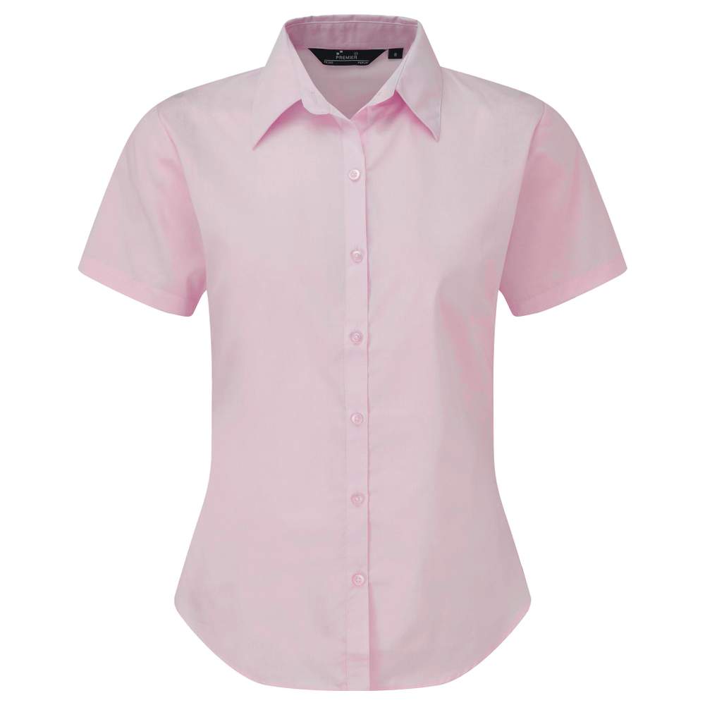 Camisa de manga curta para mulheres, feita de tecido popeline para uma limpeza fácil. Ele apresenta um colar macio e um corte justo com pregas para uma silhueta valorizada. Este modelo é composto por poliéster 65% e algodão 35%.