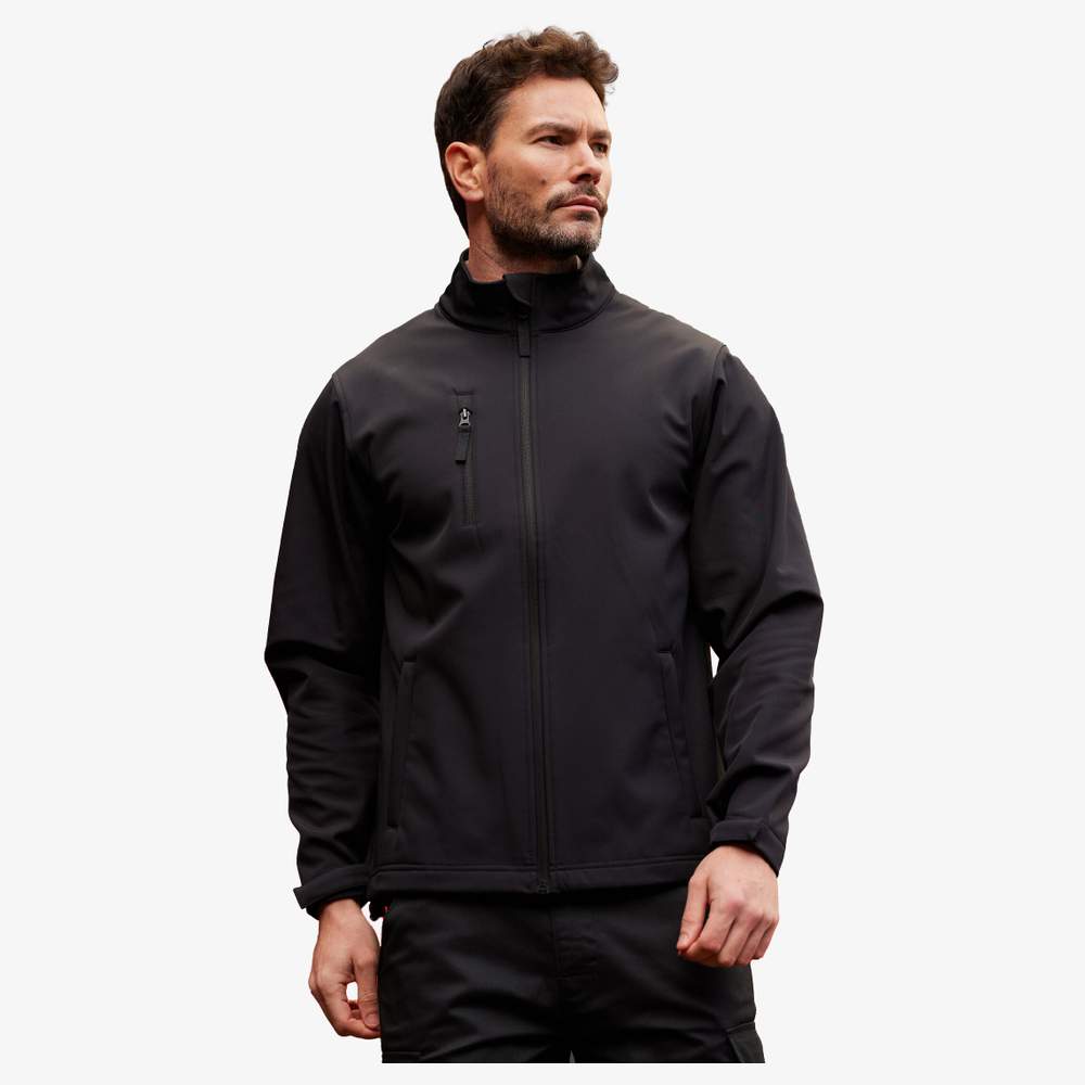 Jaqueta softshell padrão. Corte padrão concebido para oferecer conforto e funcionalidade. Possui um zíper integral na frente, bolsos laterais e um bolso no peito, todos com zíper para armazenamento seguro. O tecido softshell de três camadas oferece proteção contra o vento e chuvas leves. Uma aba para o queixo evita irritações, enquanto uma aba de tempestade interna reforça a proteção contra as intempéries. A barra possui cordões ajustáveis para personalizar o ajuste e reter o calor. Esta jaqueta é concebida para uso polivalente, oferecendo um equilíbrio entre conforto, proteção e funcionalidade.