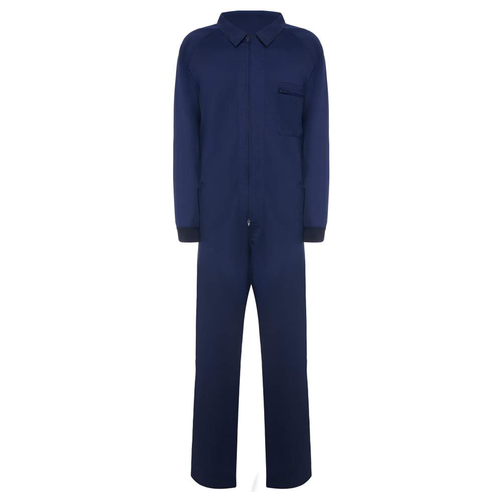 Combinação direita confeccionada em sarja de poliéster e algodão. Ela apresenta um fechamento zíper central, um bolso no peito com zíper à esquerda, dois bolsos laterais e um bolso lateral estreito. Os punhos são elásticos com borracha 1x1 para um ajuste confortável. A etiqueta é destacável.