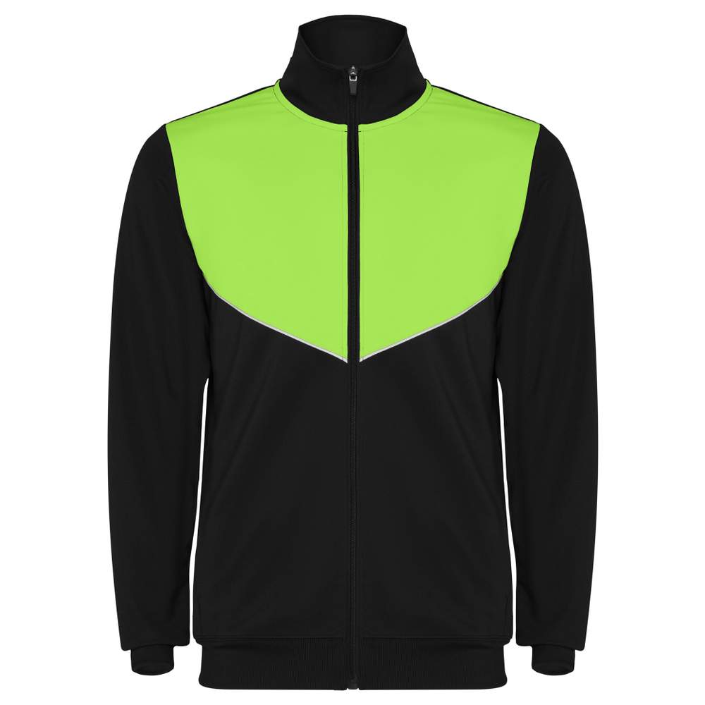 Jaqueta de treino de duas pecas confeccionada em tecido leve e elastico. Ela apresenta um peito contrastante em cor e uma gola alta com costuras contrastantes. Um fecho zip central assegura o fechamento da jaqueta e bolsos laterais oferecem um espaco de arrumacao pratico. Os punhos e a cintura sao dotados de costas 2x2 para um ajuste confortavel. A calca combinada dispõe de uma cintura elastica e um cordão de aperto para um mantimento personalizado. Uma etiqueta destacavel permite uma identificacao facil. Pecas laterais contrastantes com garnitura de costura adicionam um toque estetico. O baixo da calca é equipado com fechos zip.