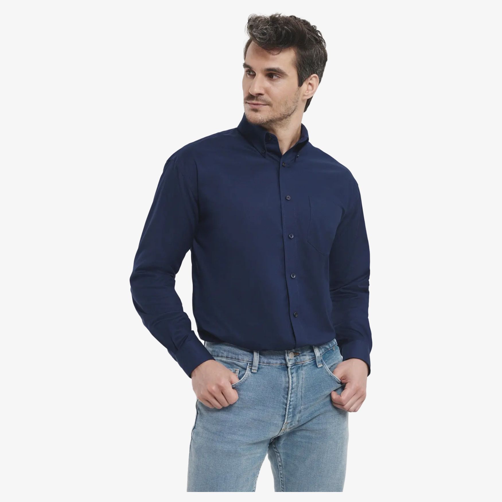 A Camisa Oxford Clássica de Manga Comprida para Homem é adequada para o dia a dia, com colarinho abotoado, bolso no peito em V do lado do coração, pala nas costas e base arredondada.