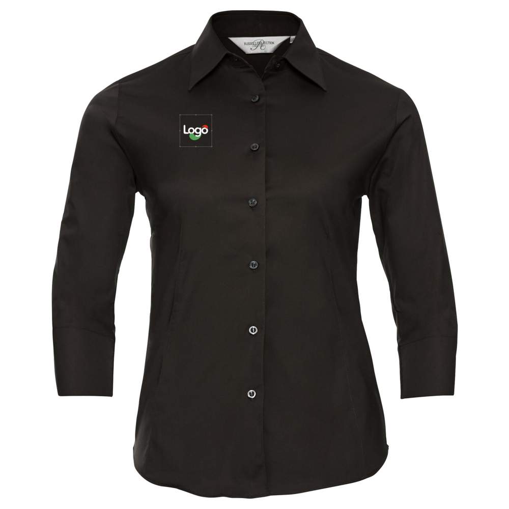 Camisa ajustada de algodão/elastano oferecendo conforto e liberdade de movimento. Tecido esticável para um uso agradável. Pregas na parte de trás e na frente para um corte feminino lisonjeiro. Fechamento com 7 botões da mesma cor. Colar clássico com botão único. Sem bolso. Mangas três quartos com punhos fendidos. Composição: algodão/elastano. Esta camisa é ideal para personalização com bordados, permitindo a adição do seu logotipo ou elementos gráficos para uma imagem de marca coerente.