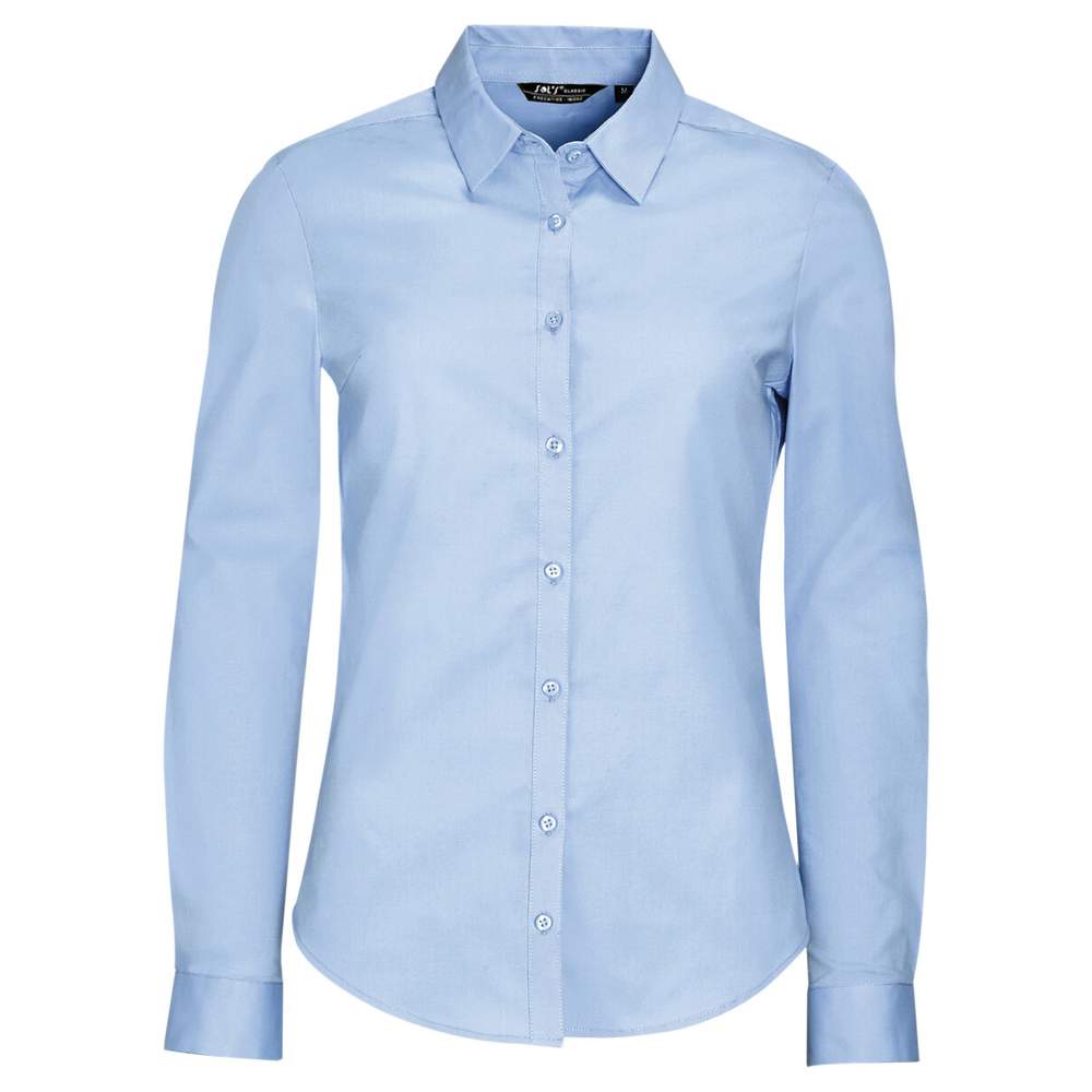 Esta camisa feminina esticável oferece um corte ajustado lisonjeiro e um colar intemporal clássico. Ela é dotada de uma abotoadura com oito botões no mesmo tom e punhos com um botão. As pregas na frente e nas costas garantem um ajuste ótimo e uma silhueta feminina. Confeccionada com cuidado, esta camisa é ideal para um visual profissional ou descontraído.
