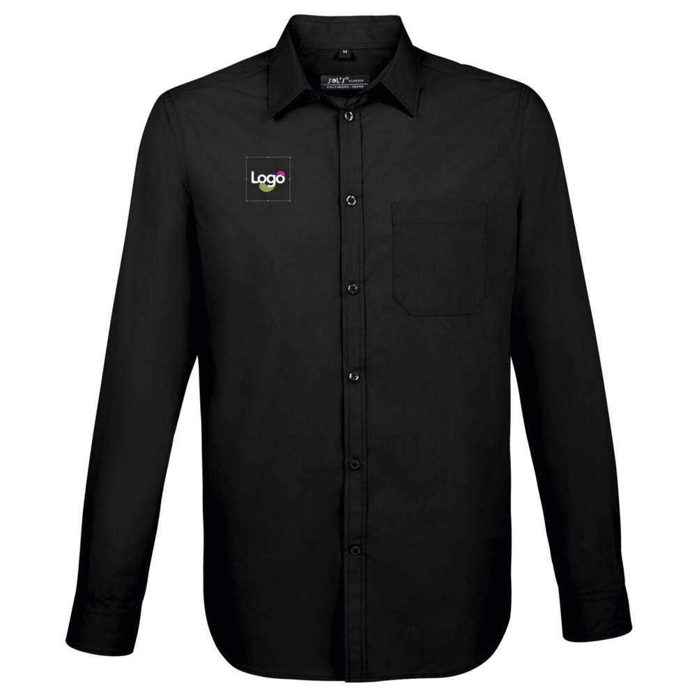 Camisa masculina de popelina mangas compridas SOL'S Baltimore fit. Confeccionada em popelina poliester - algodão, com um colar clássico reforçado, baleines removíveis, um bolso do lado esquerdo, uma aba com 7 botões na mesma cor e punhos com 2 botões ajustáveis com aba capuz. Este modelo é ideal para personalização por bordado ou impressão do seu logotipo.