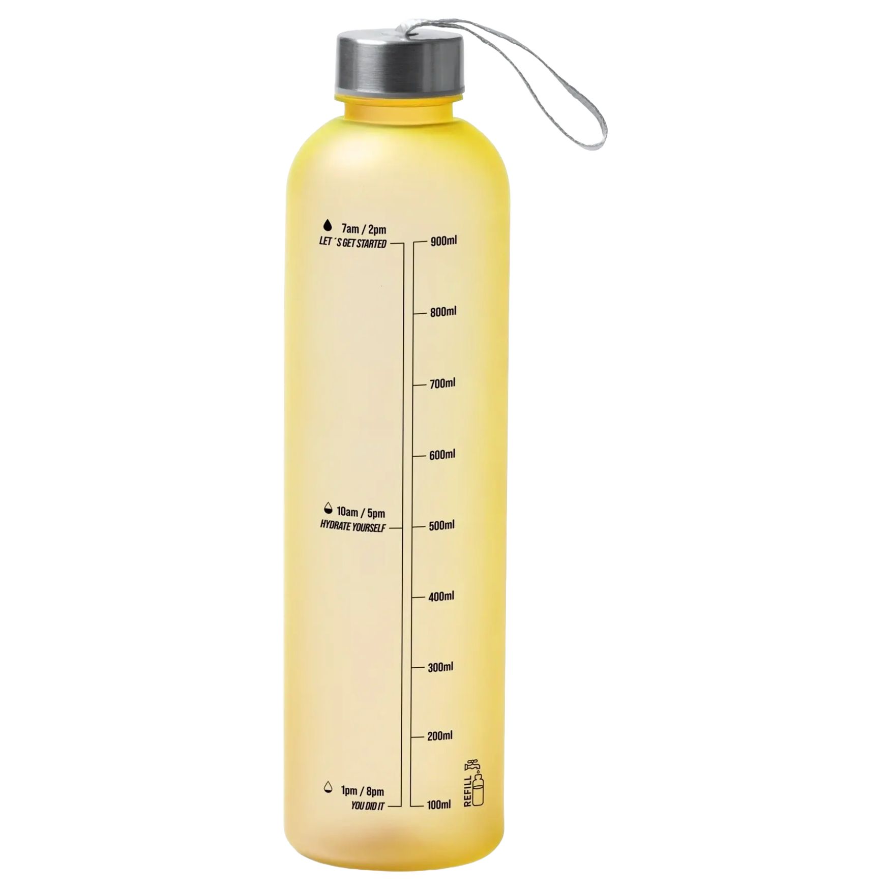 A garrafa YOGER em tritan tem um corpo translúcido, uma tampa de rosca e uma pega de transporte. Um indicador de capacidade e uma recomendação de hidratação facilitam o acompanhamento no dia a dia.