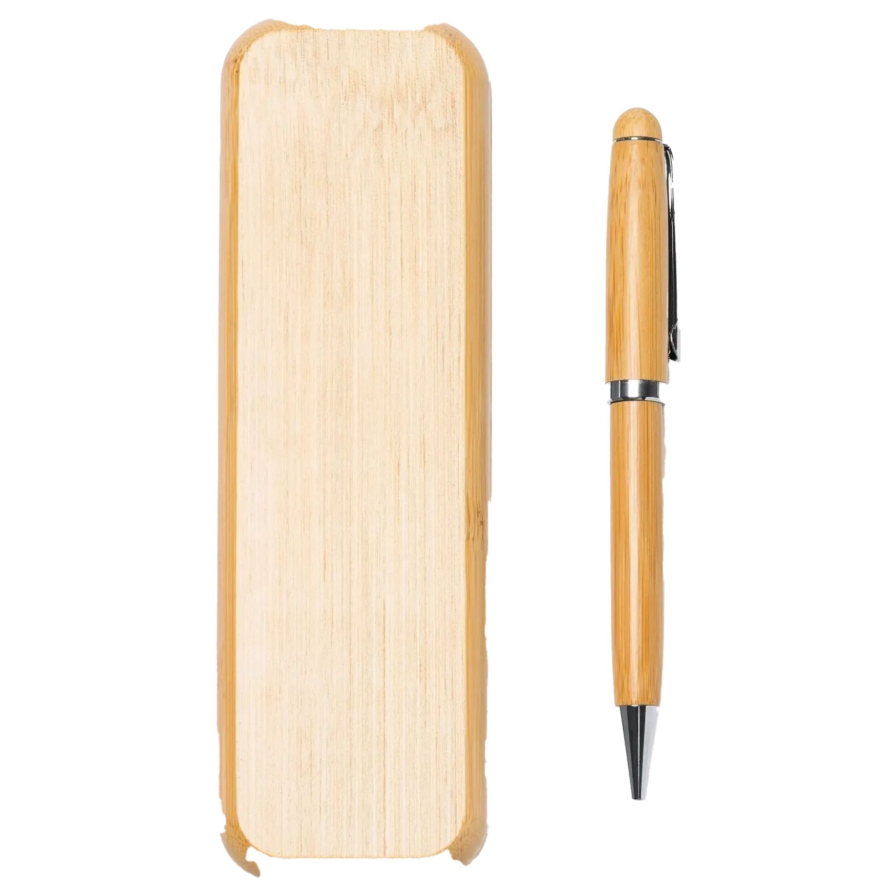 A caneta esferográfica Bodoni em bambu, com mecanismo rotativo e tinta azul, é adequada para a escrita do dia a dia. Estojo em bambu com fecho magnético.