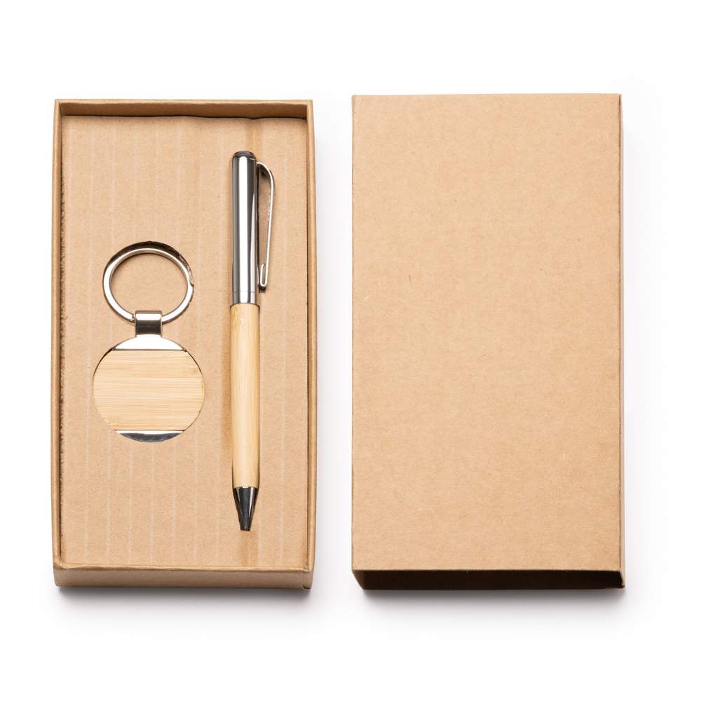 Este conjunto inclui uma caneta esferográfica e um chaveiro, ambos fabricados em bambu com detalhes metálicos. A caneta é equipada com tinta azul. O conjunto é apresentado em um estojo ecodesign, projetado para armazenamento e transporte práticos. Os materiais utilizados são selecionados por sua durabilidade e respeito ao meio ambiente. Este conjunto é adequado para uso diário, seja no escritório, na escola ou em viagens.